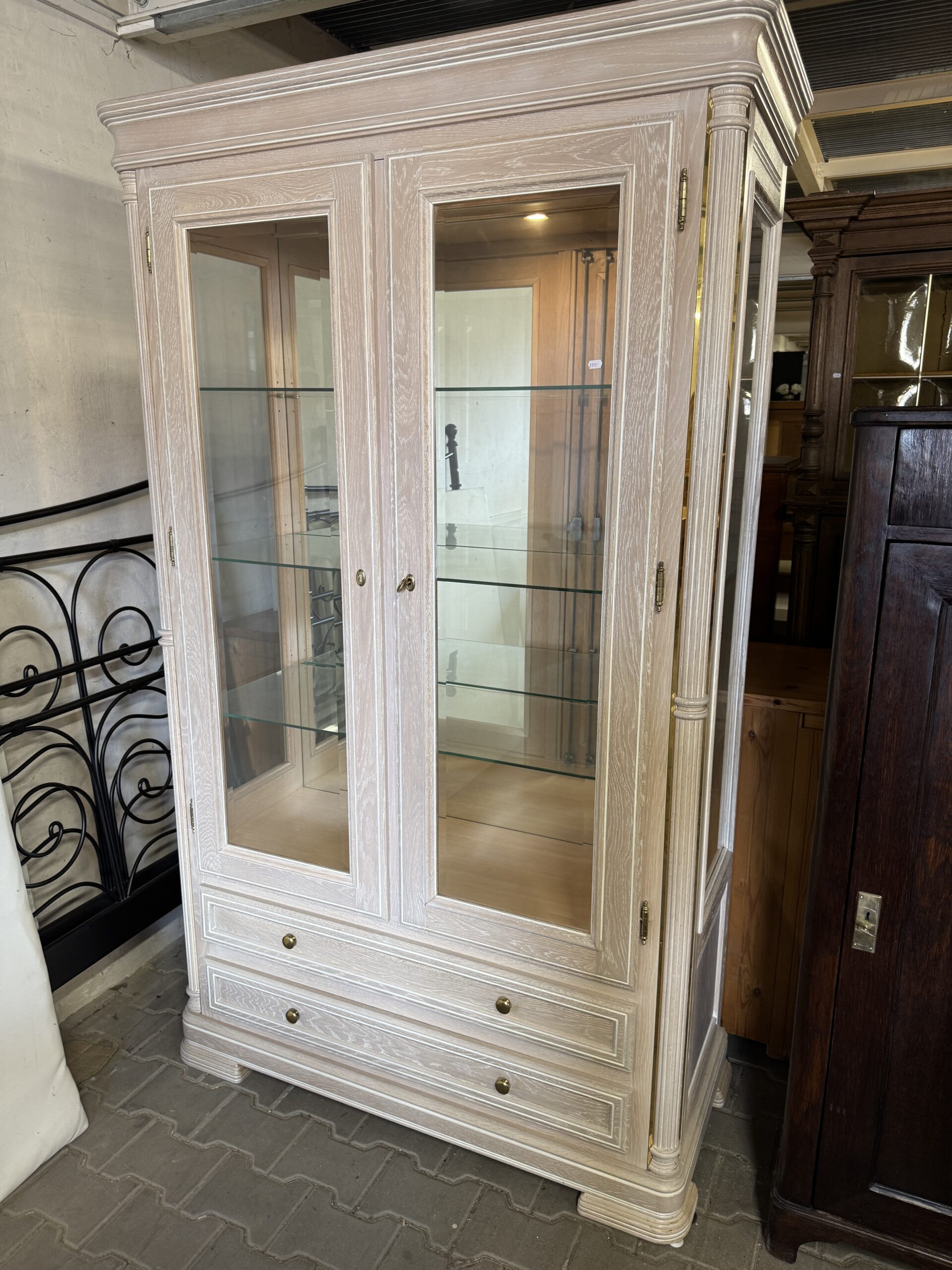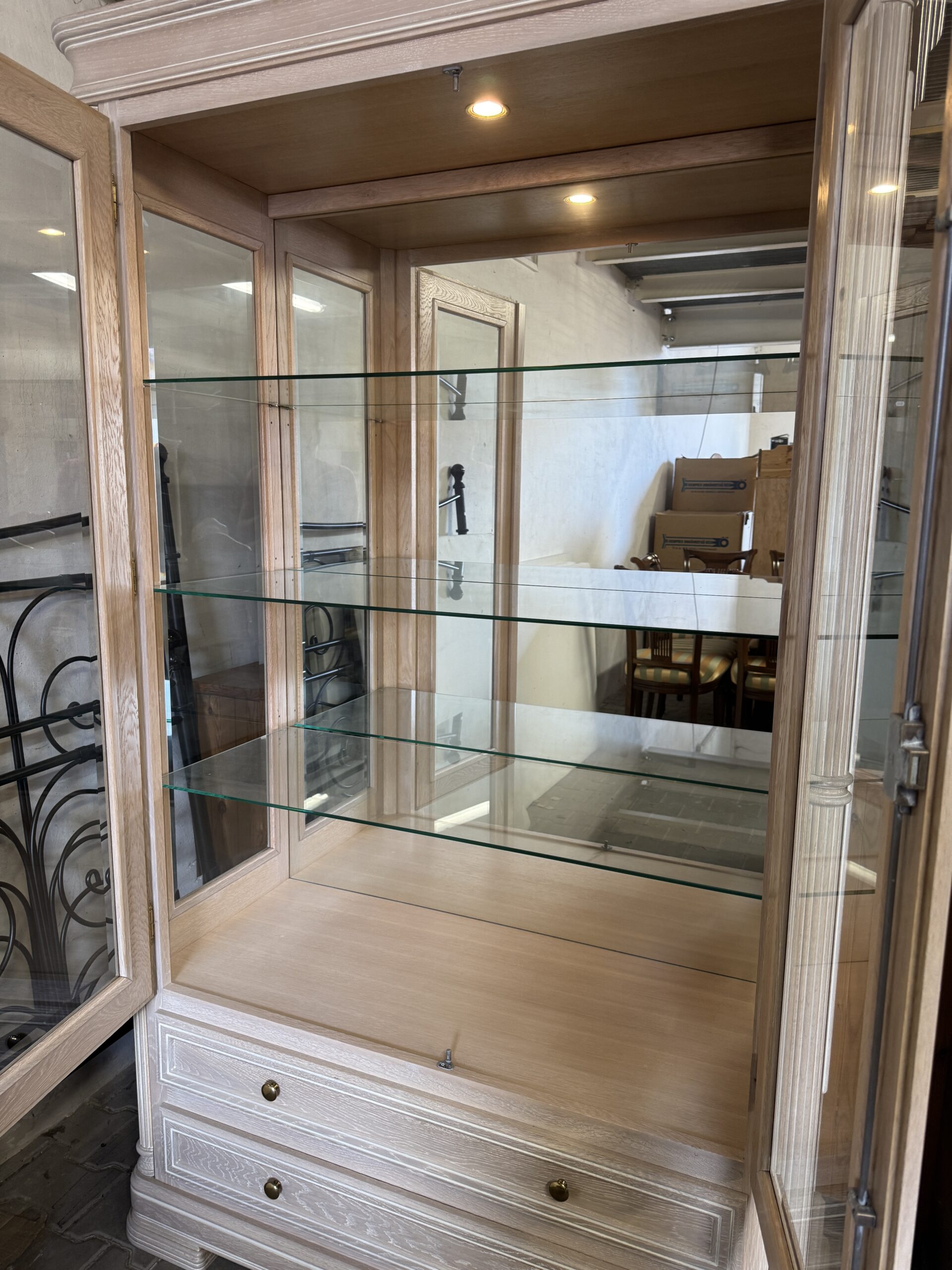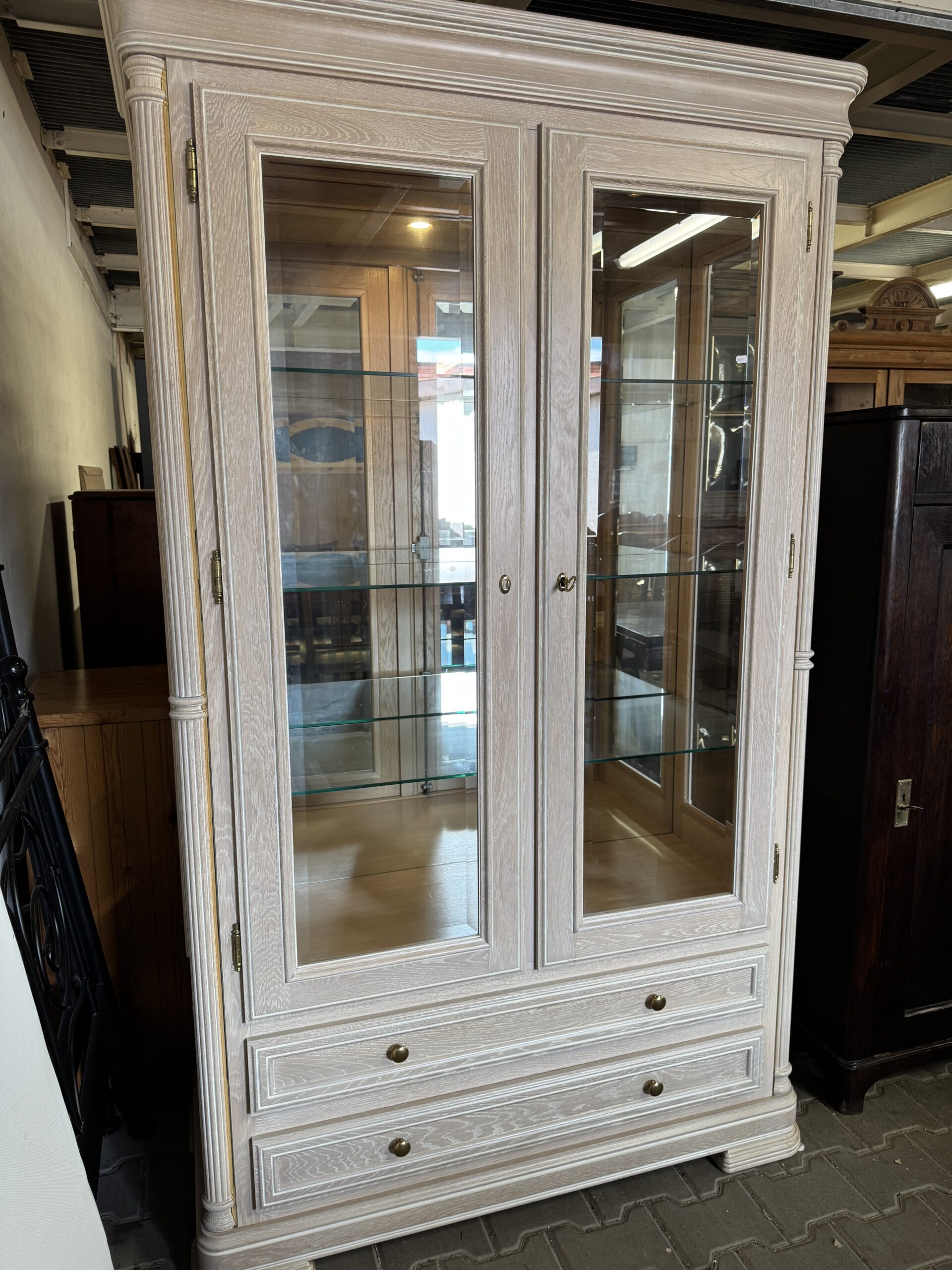 Przeszklone boczne ściany wraz ze szklanymi półkami i lustrem nadają witrynie wrażenie lekkości i przestronności oraz pozwolą idealnie wyeksponować każdą kolekcję porcelany, pamiątek lub innych przedmiotów.