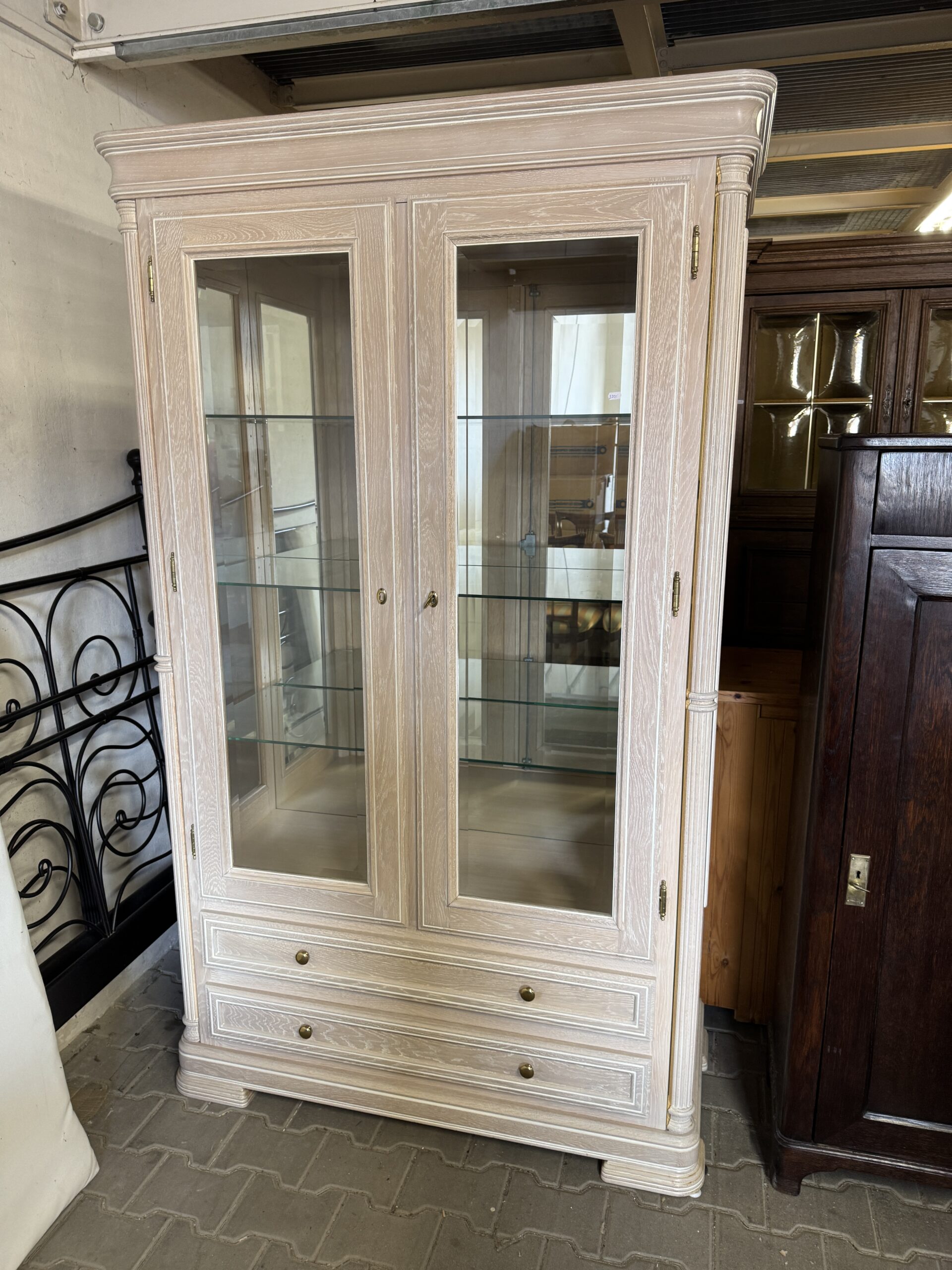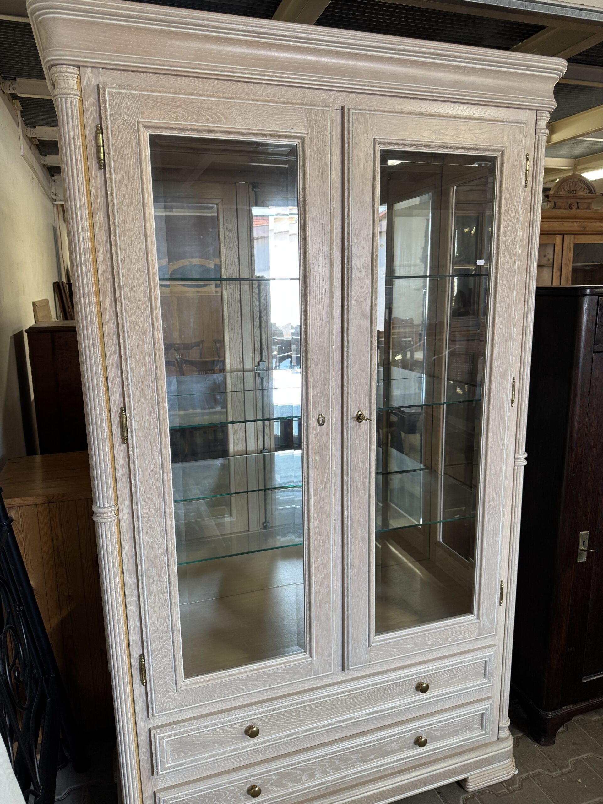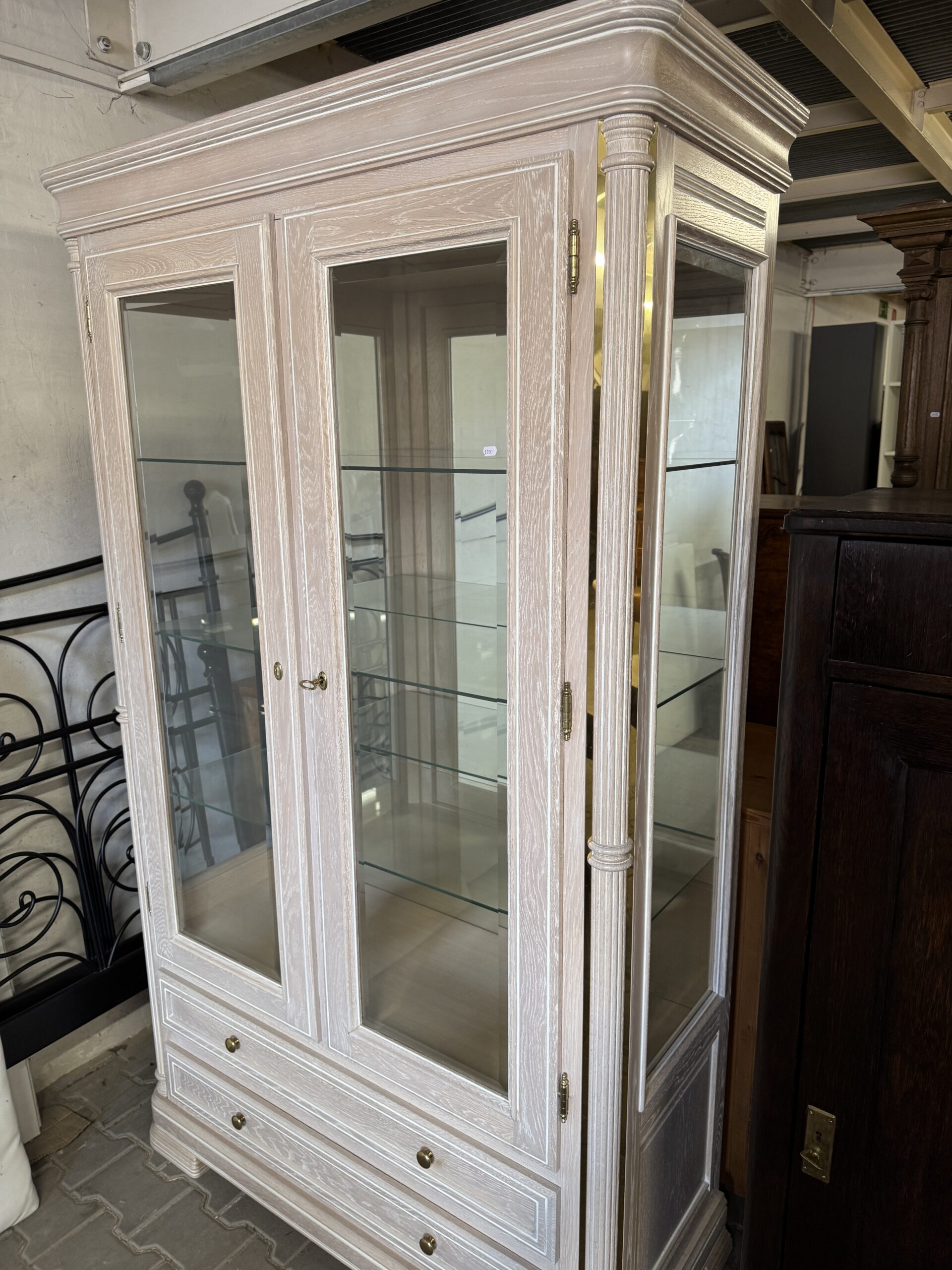 Przeszklone boczne ściany wraz ze szklanymi półkami i lustrem nadają witrynie wrażenie lekkości i przestronności oraz pozwolą idealnie wyeksponować każdą kolekcję porcelany, pamiątek lub innych przedmiotów.
