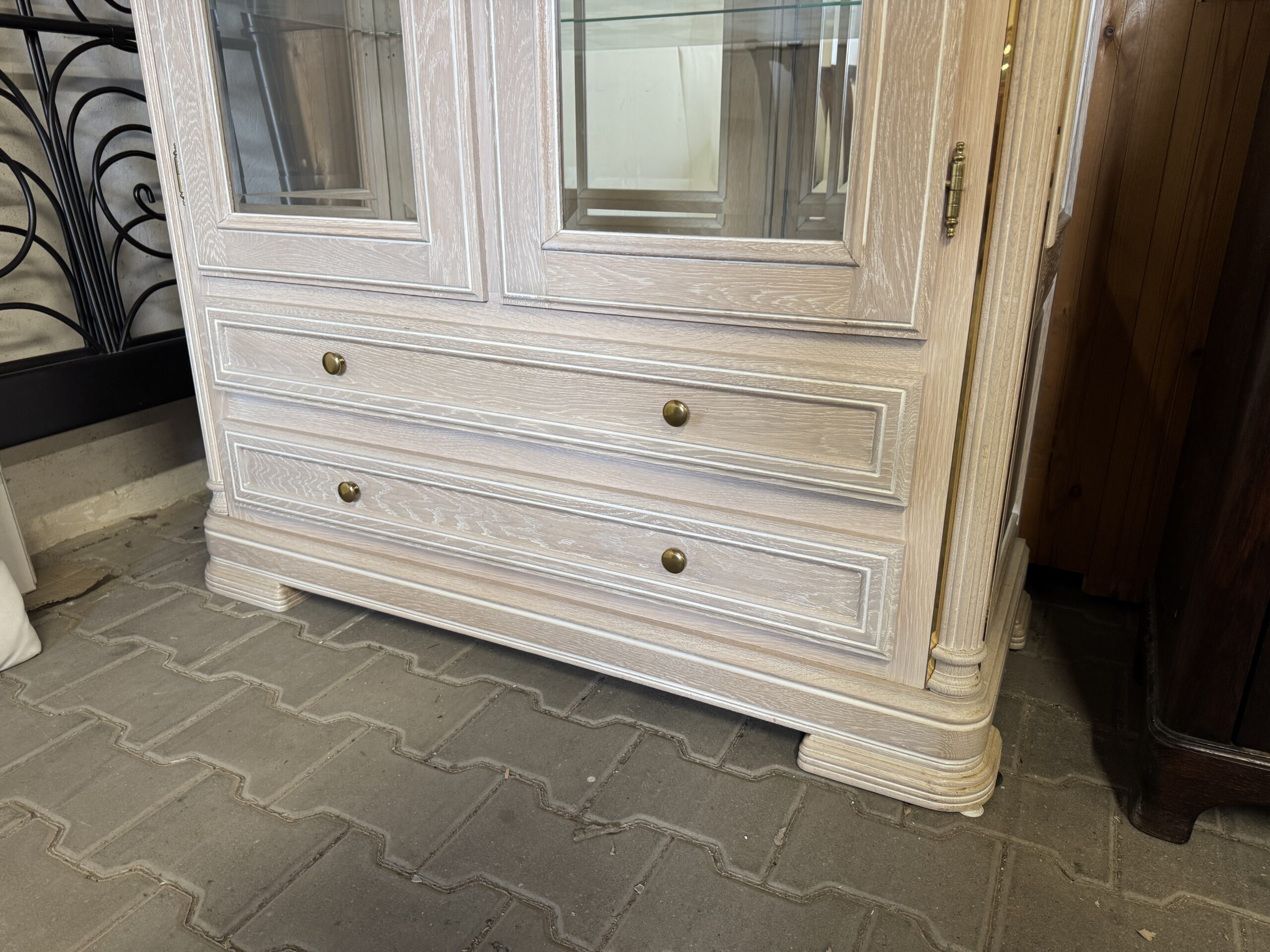 Oryginalne dekoracje w złotym kolorze w połączeniu z dekoracyjnym szkłem oraz ciepłym kolorem ecru tworzą wyjątkowy wystrój mebla.