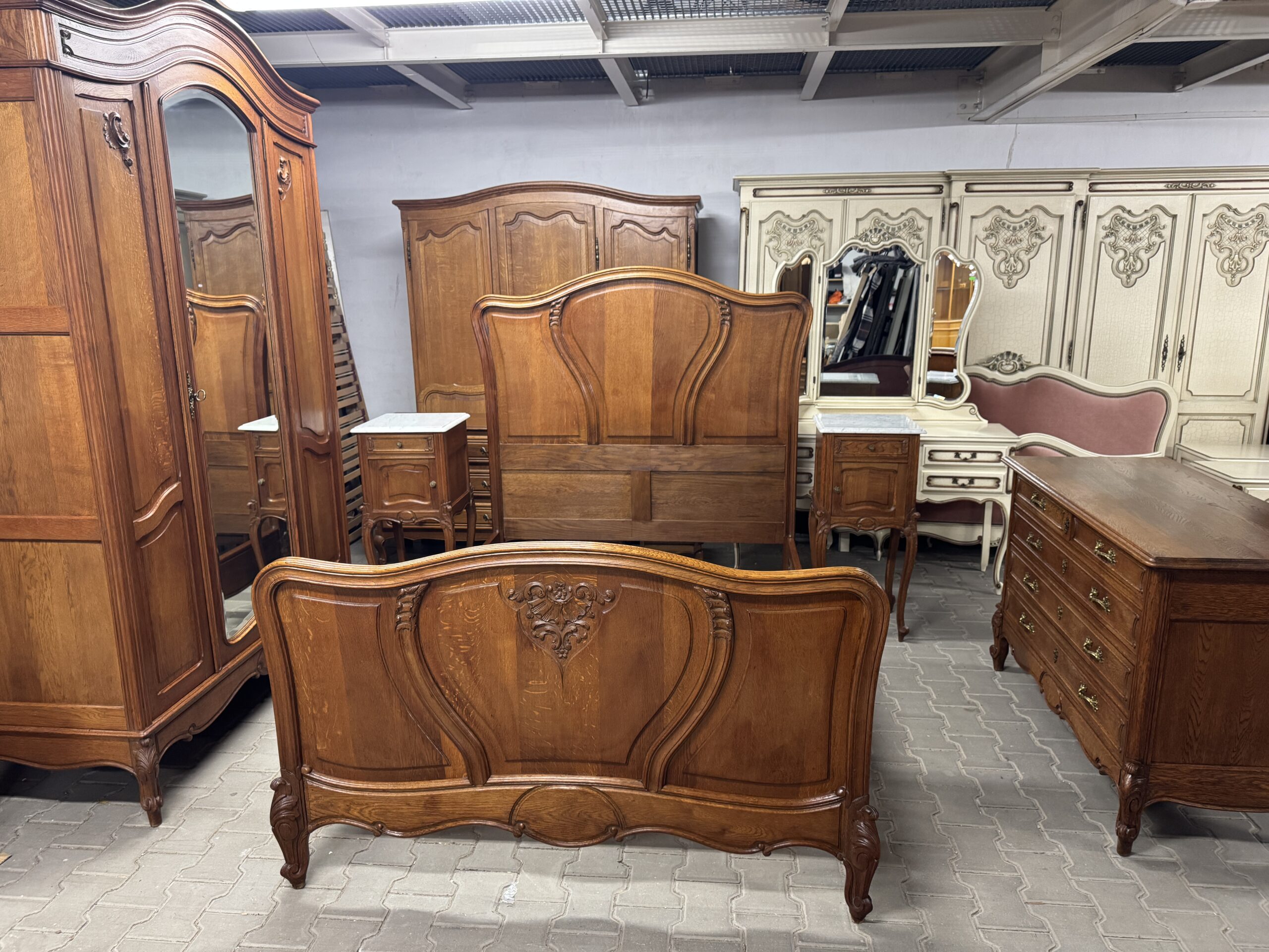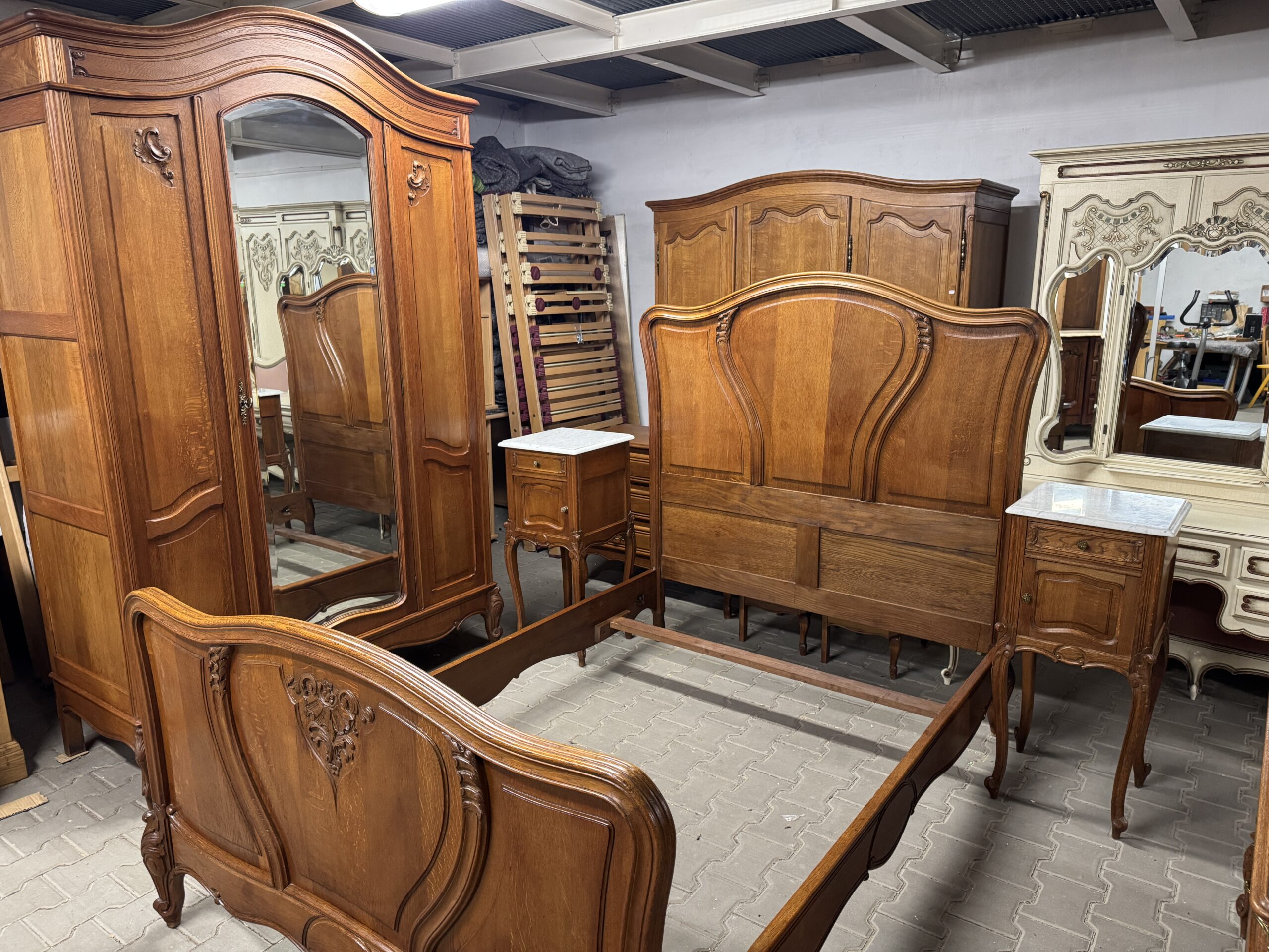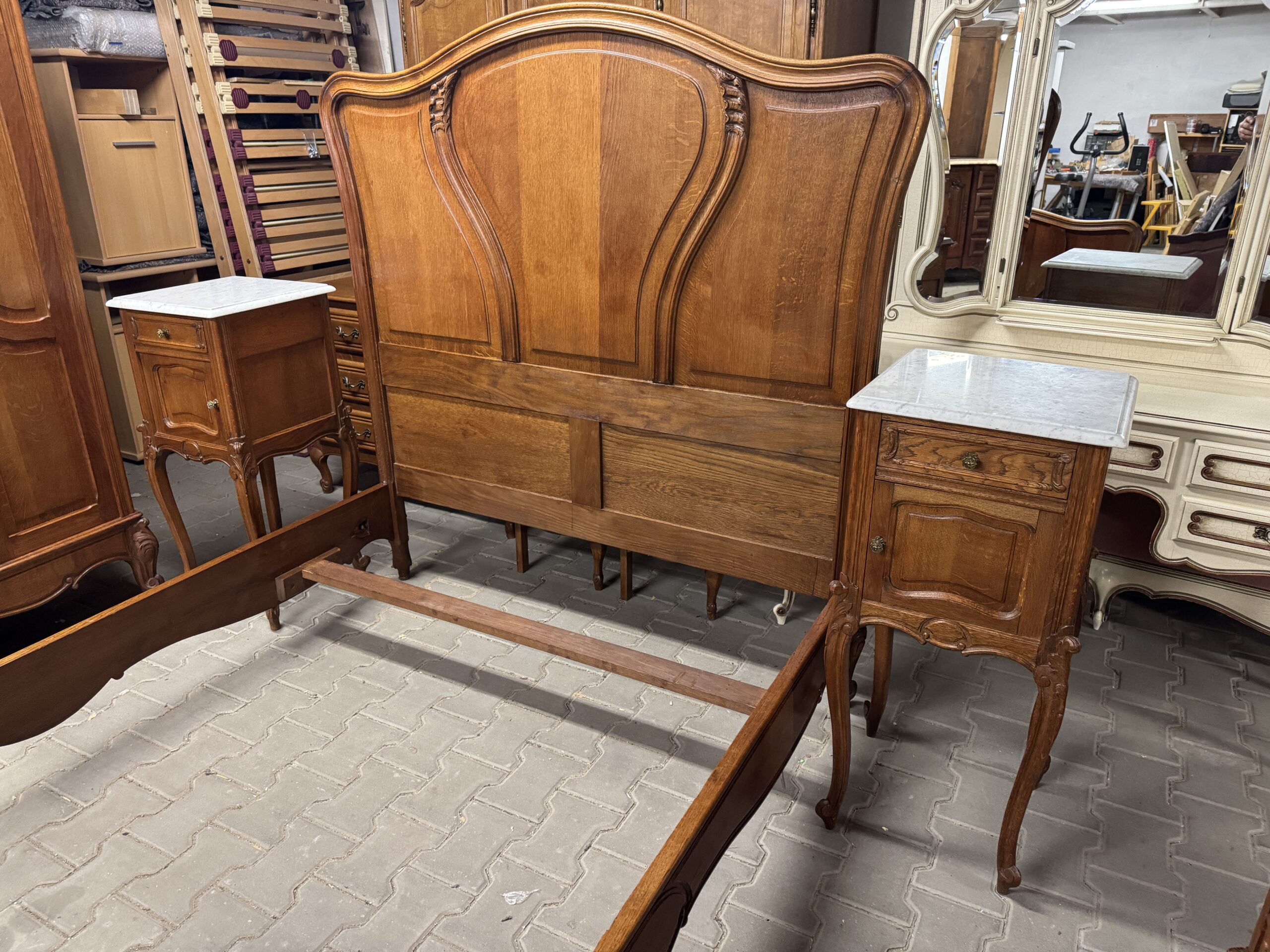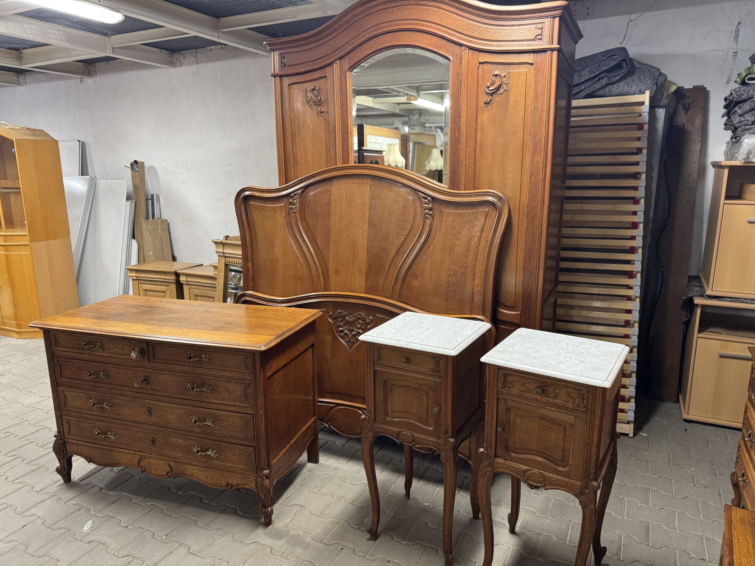 Antyczna sypialnia w stylu Ludwika: trzydrzwiowa szafa z lustrem, komoda, rama łóżka i dwie szafki nocne.