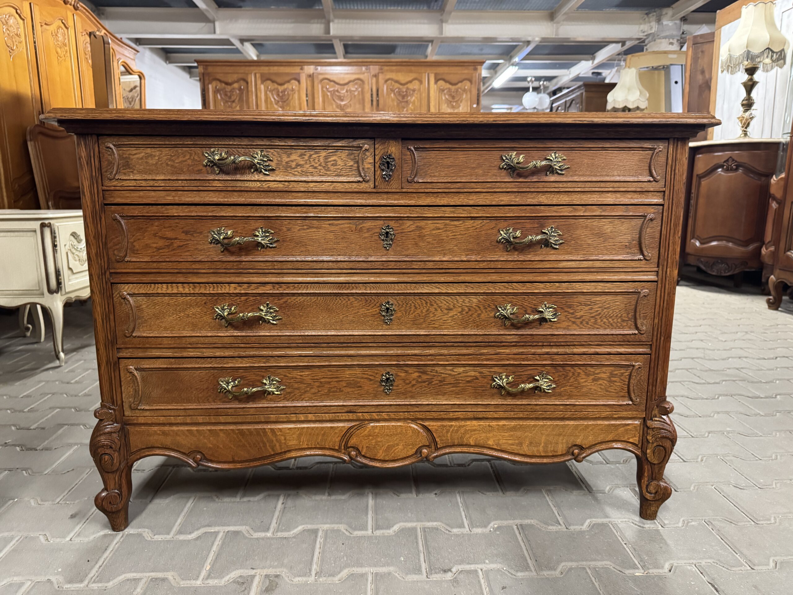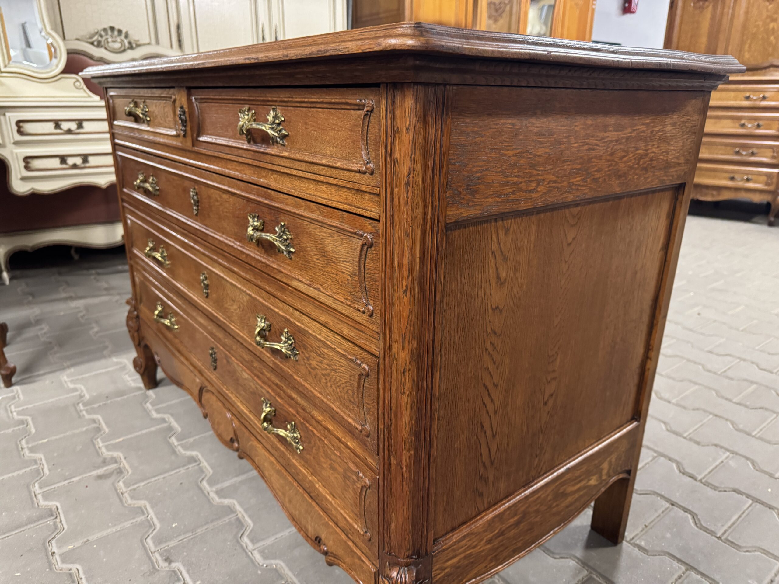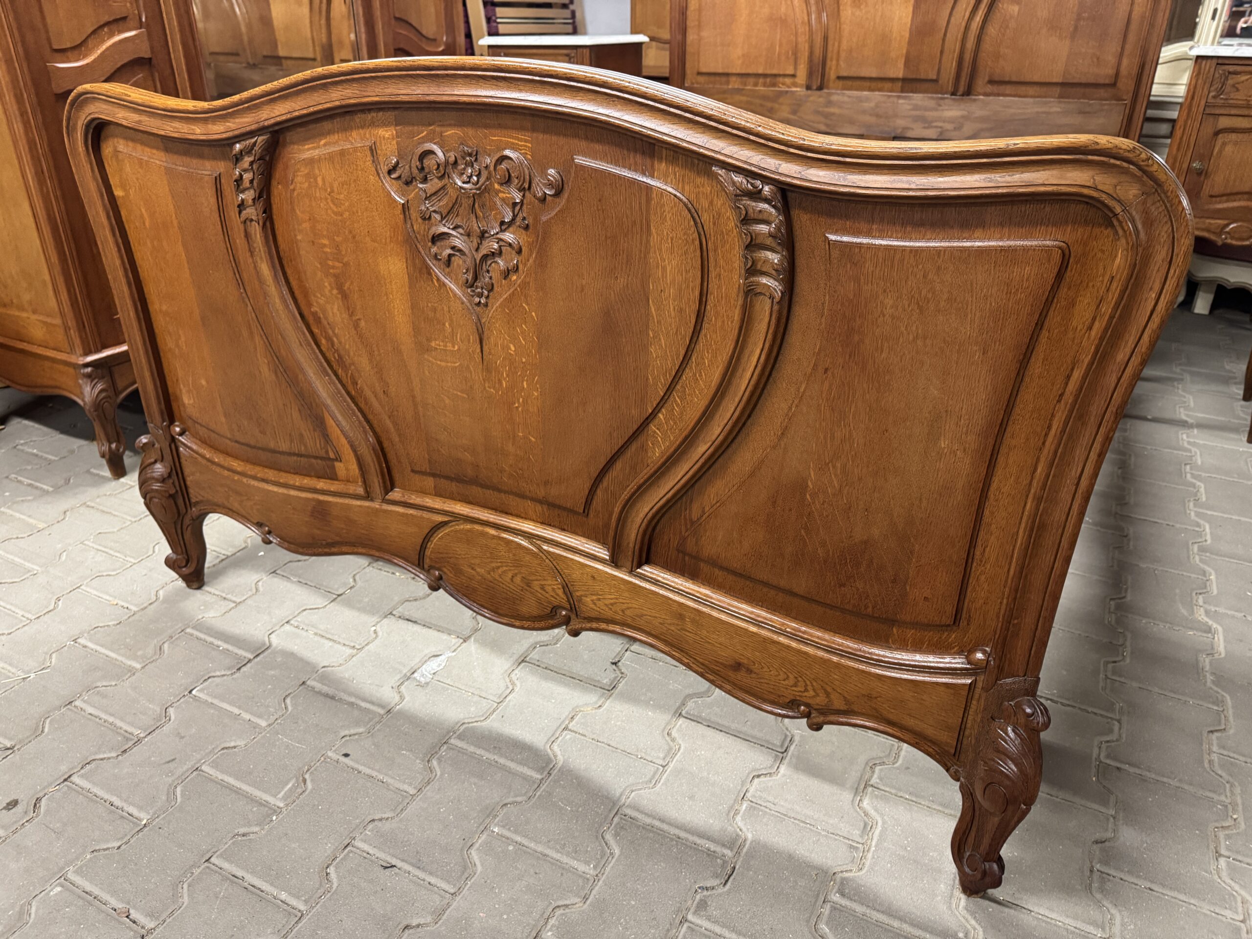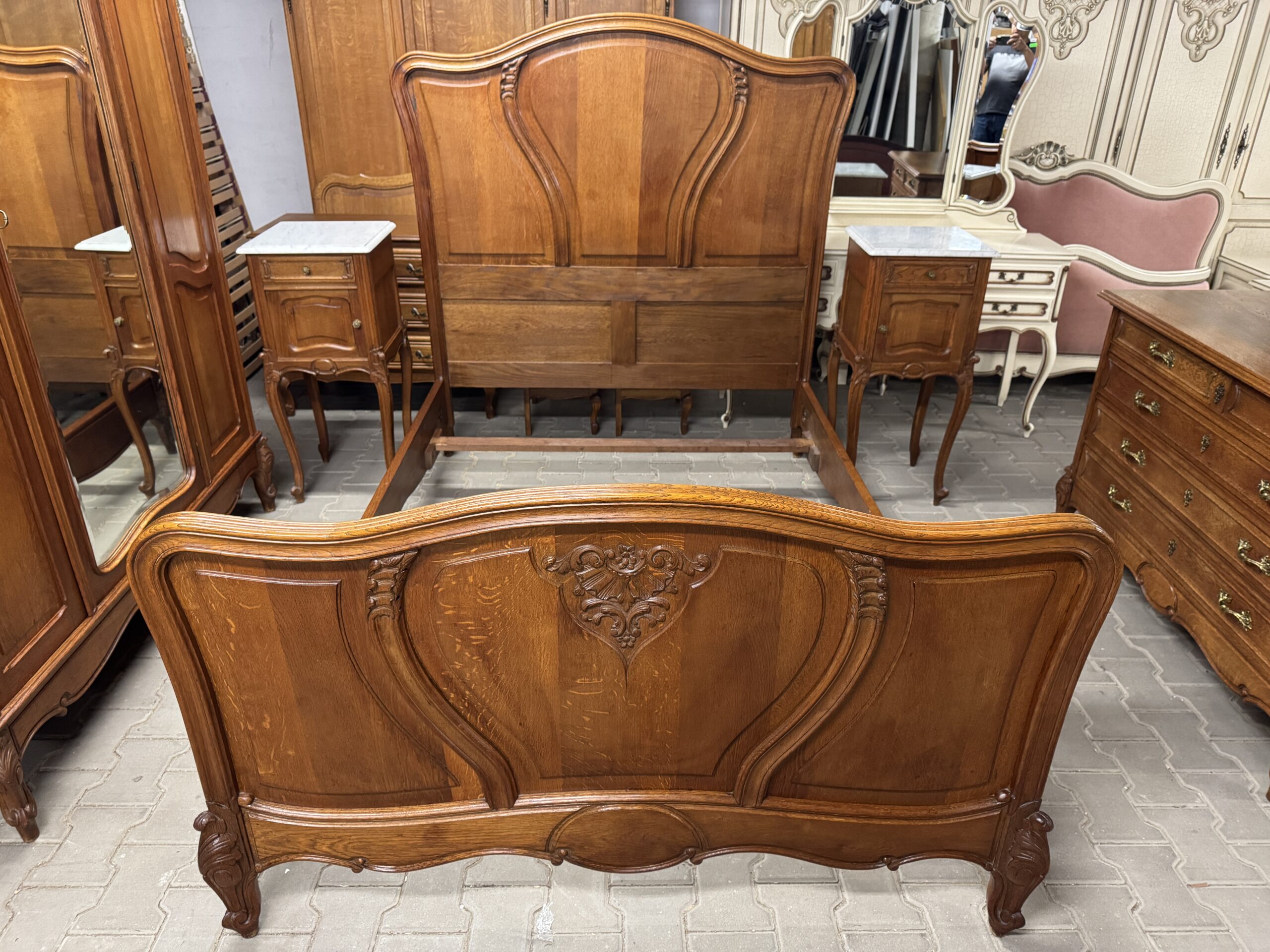 Antyczna sypialnia w stylu Ludwika: trzydrzwiowa szafa z lustrem, komoda, rama łóżka i dwie szafki nocne.