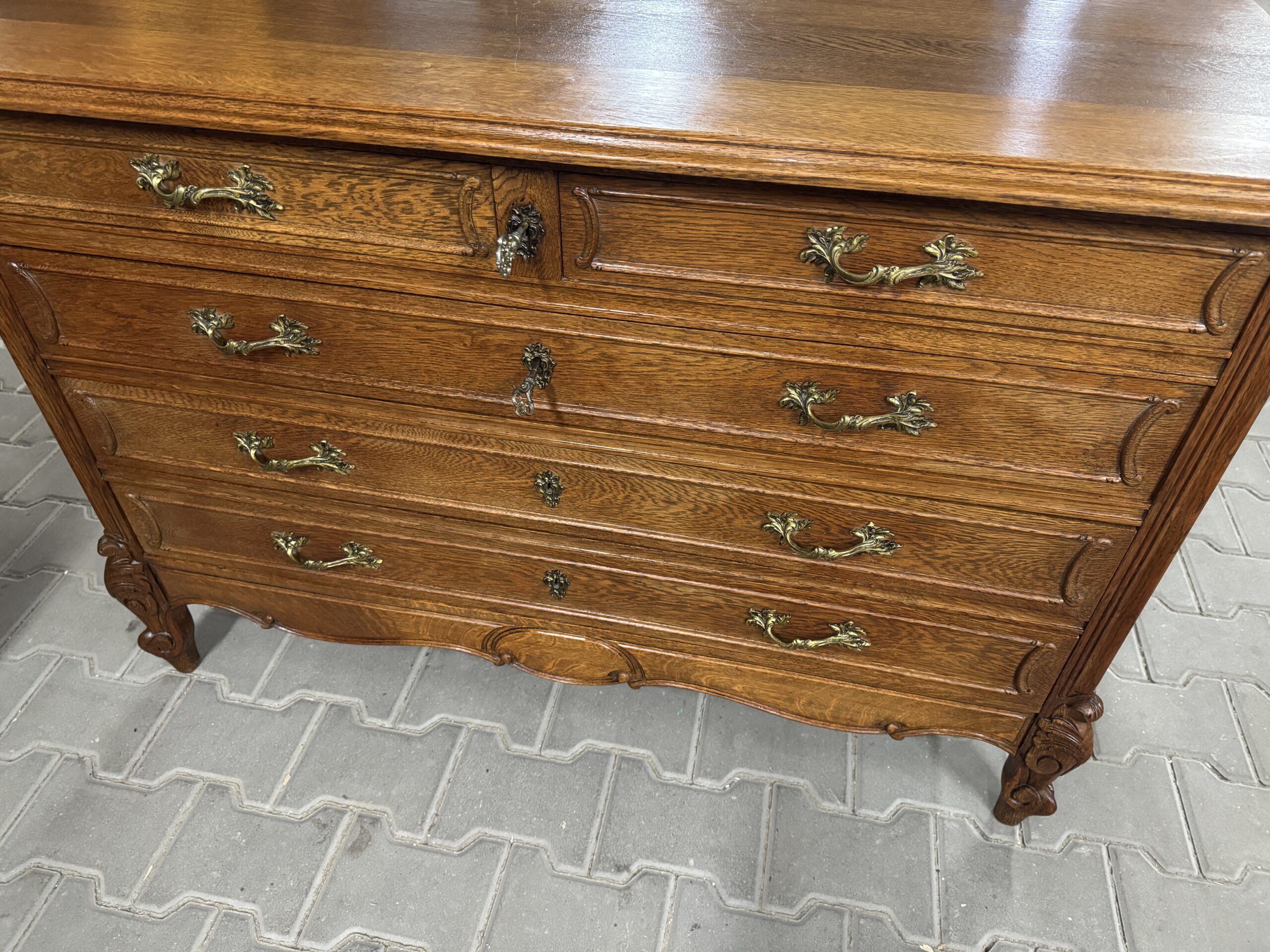 Komoda posiada trzy duże szuflady oraz dwie mniejsze w górnej części.
