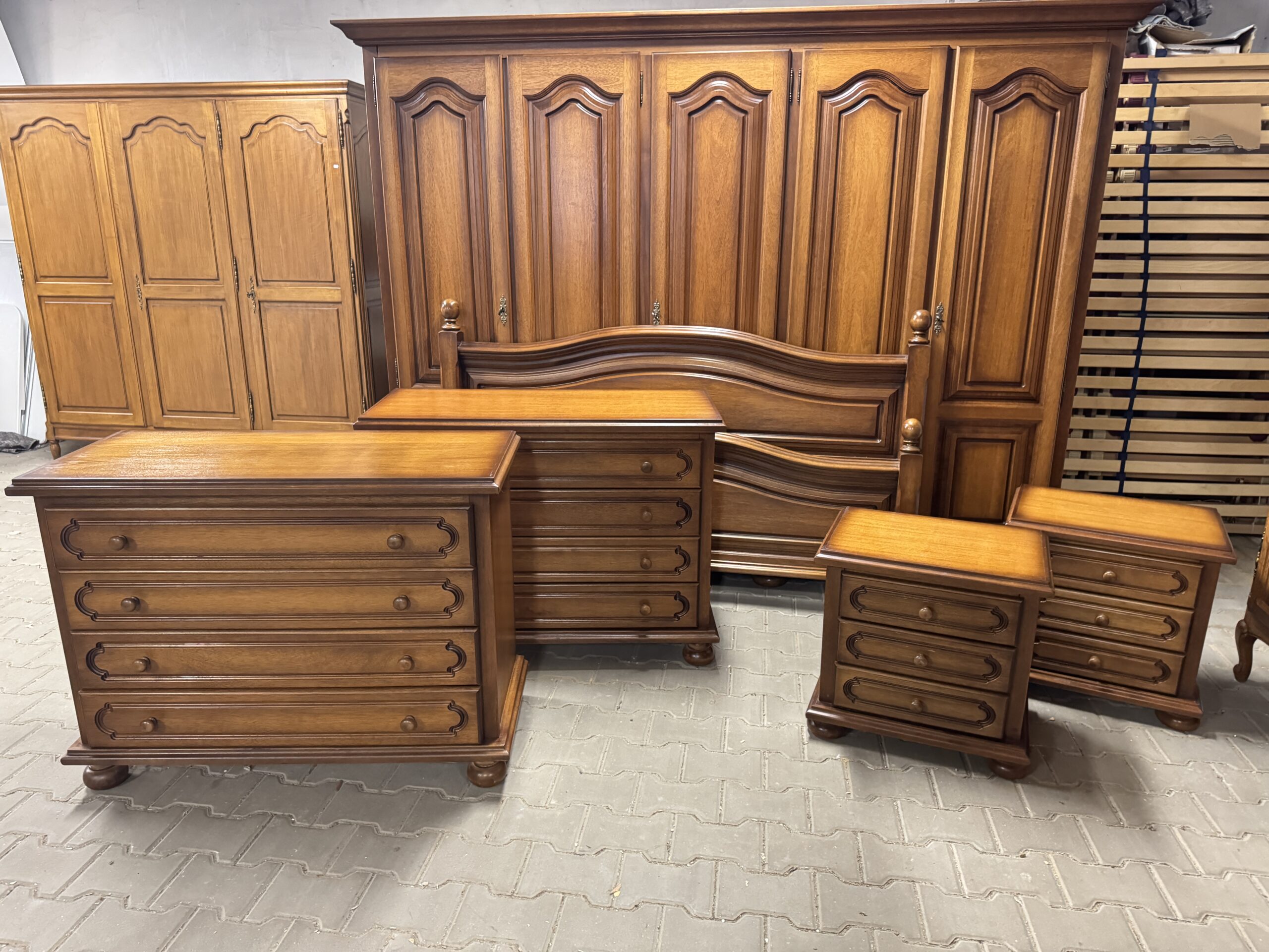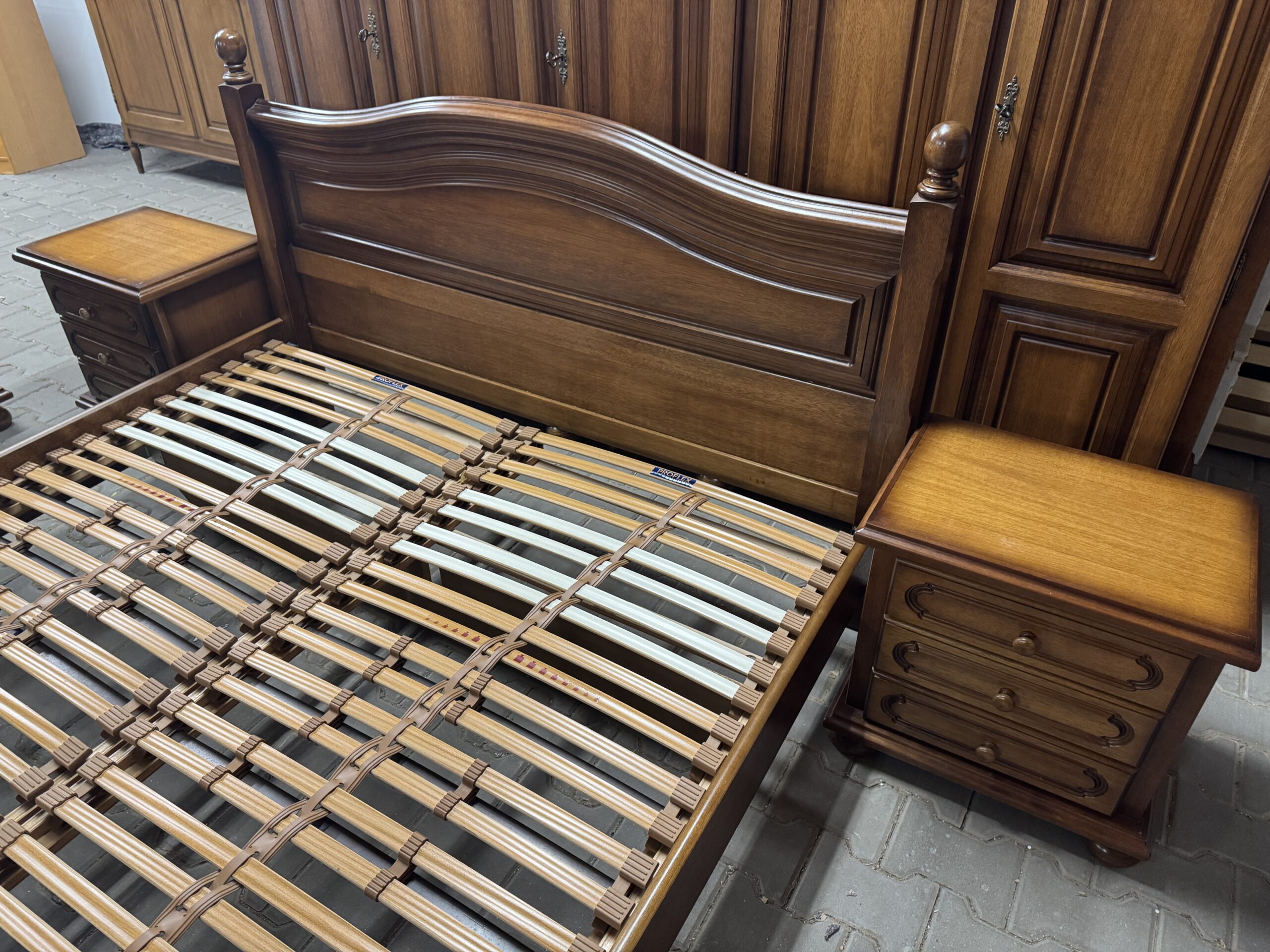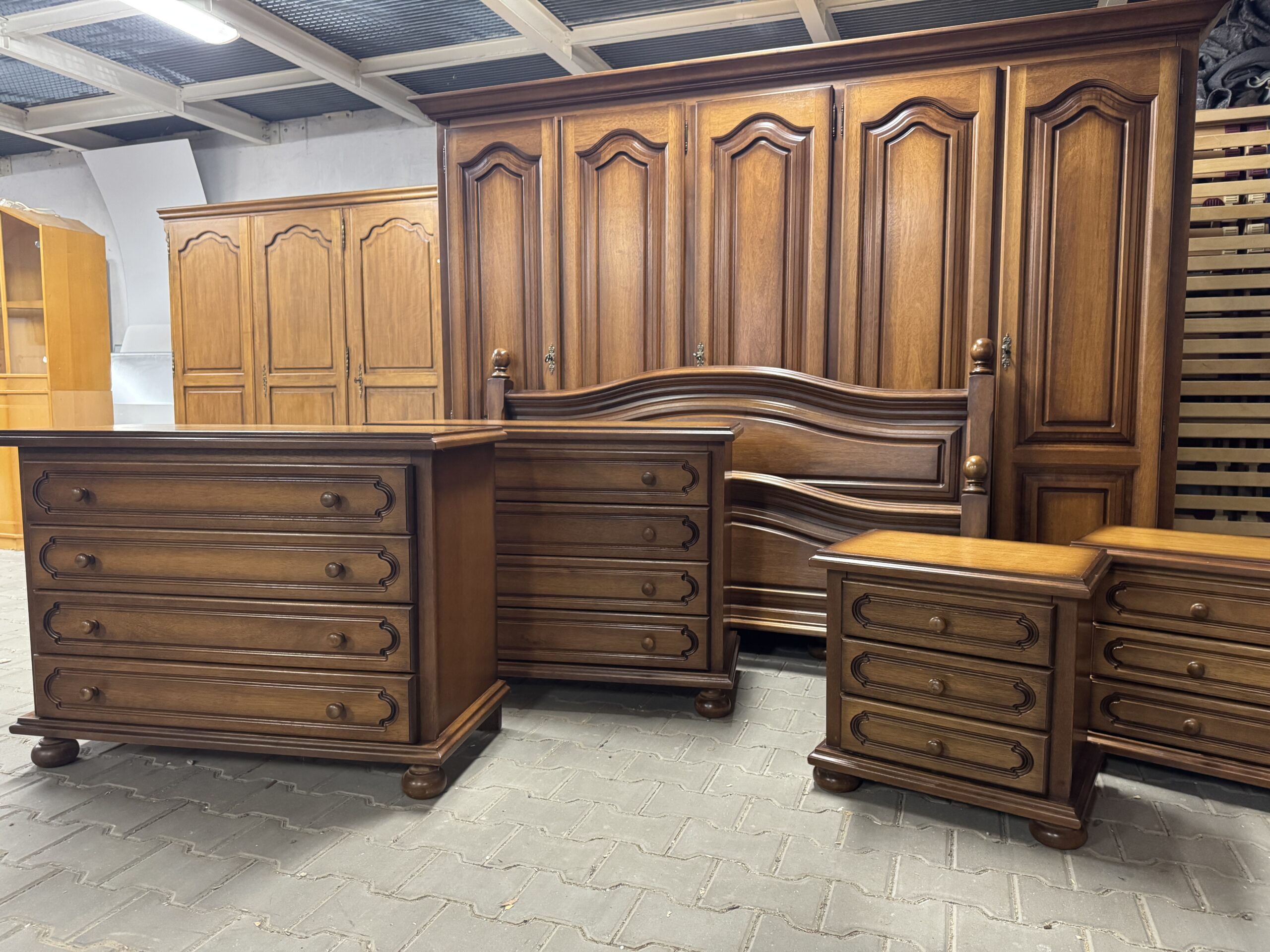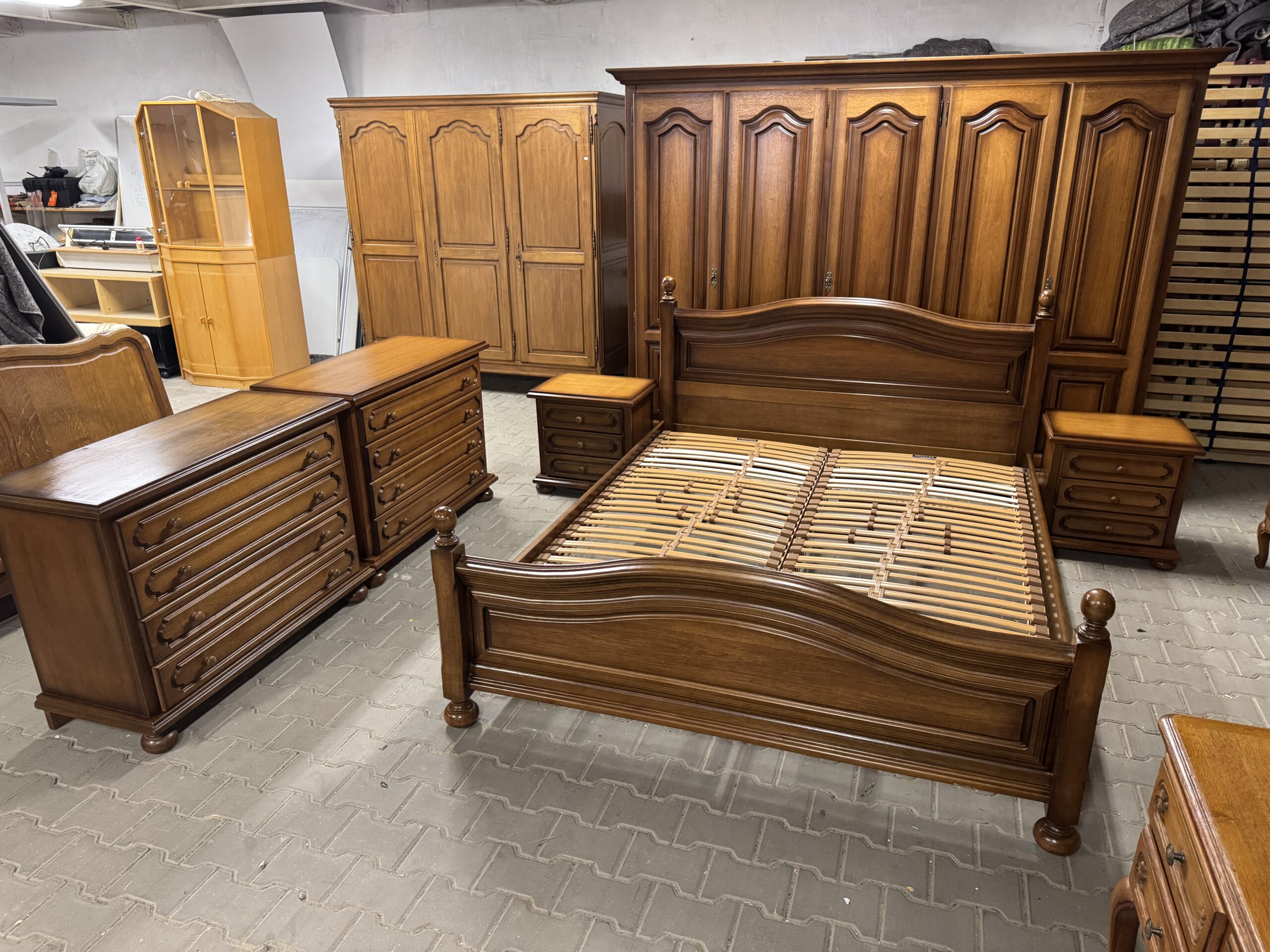Cudowny komplet mebli w styli rustykalnym: pięciodrzwiowa szafa, łóżko, dwie szafki nocne, dwie komody.