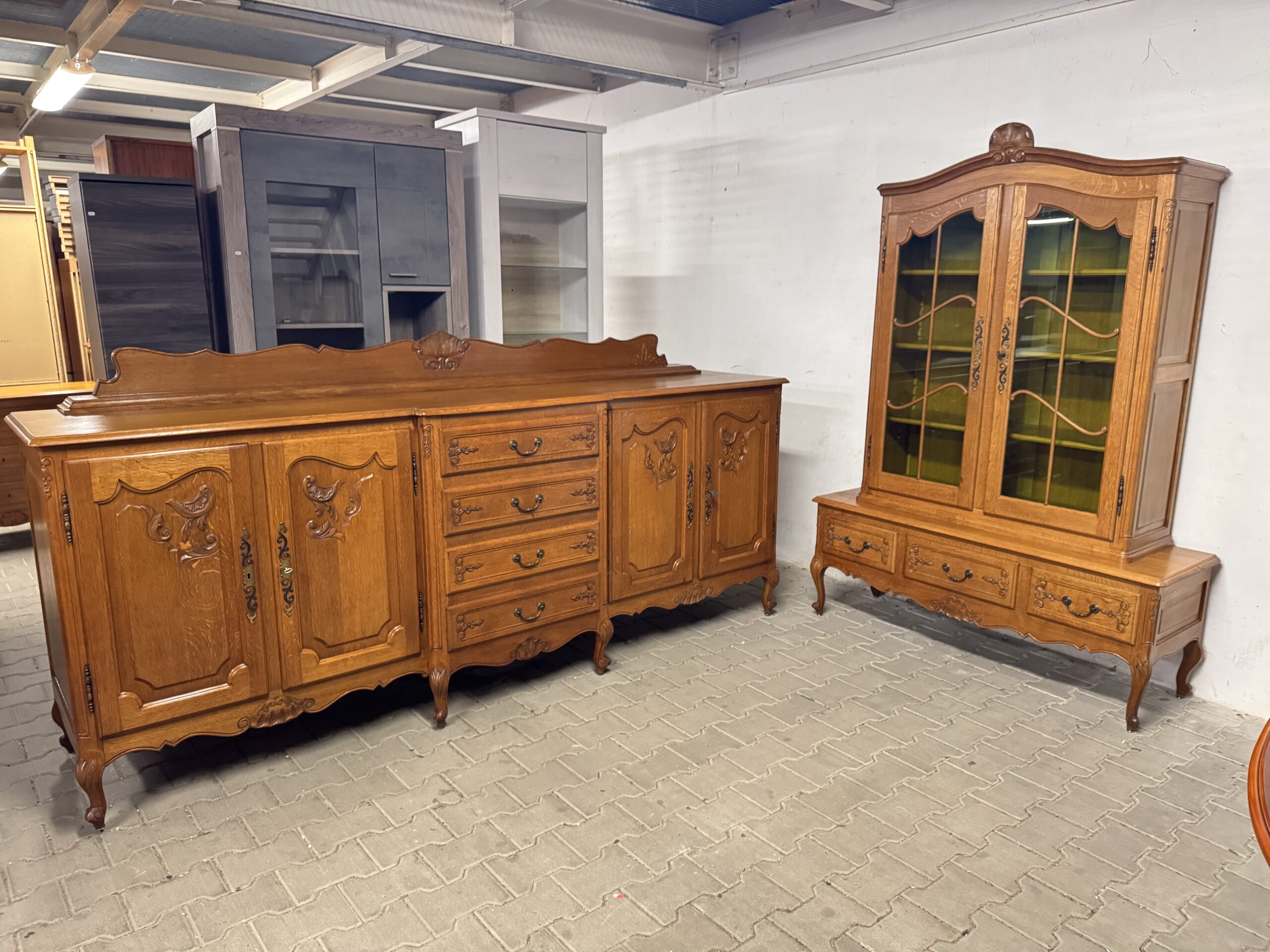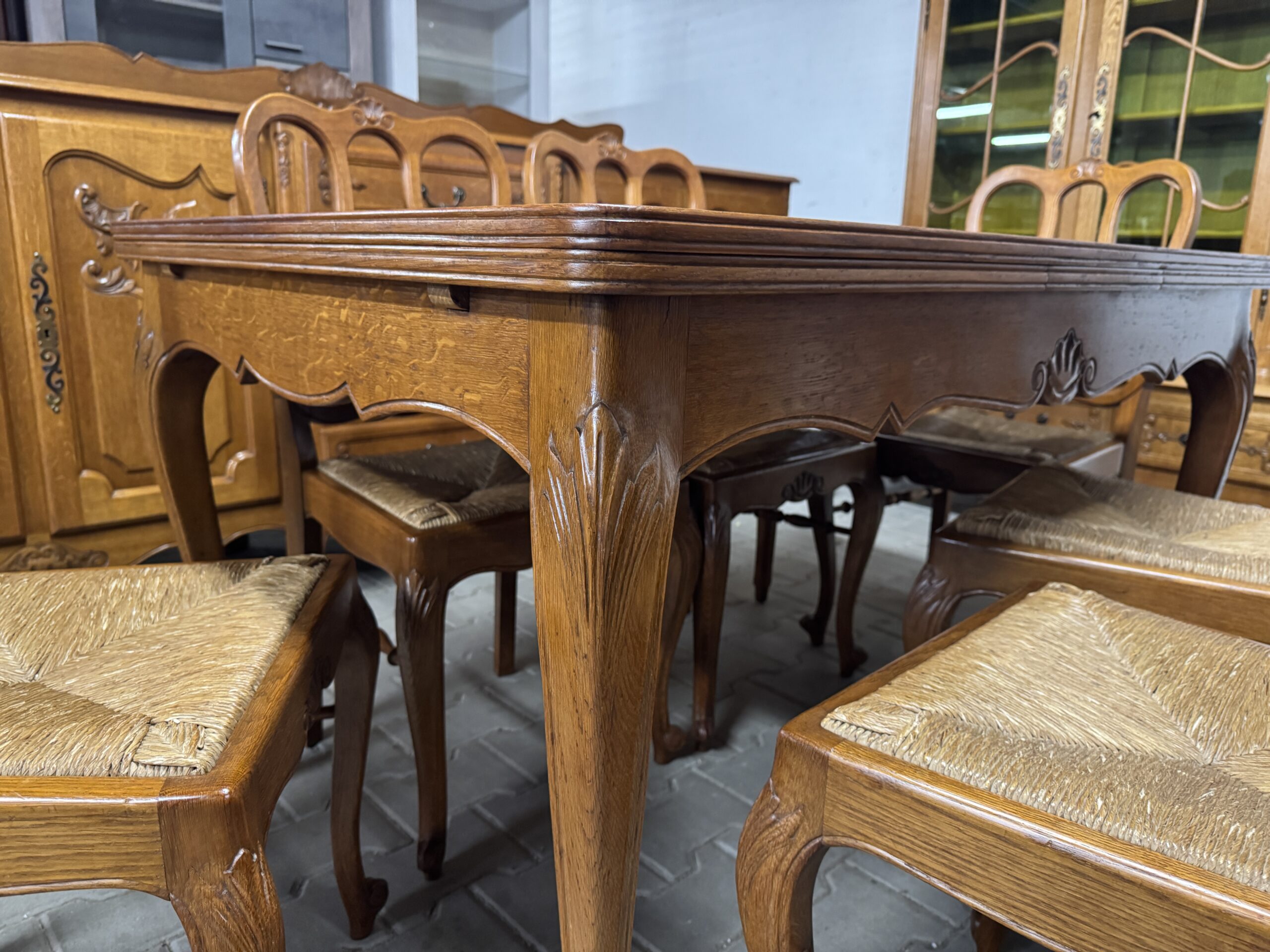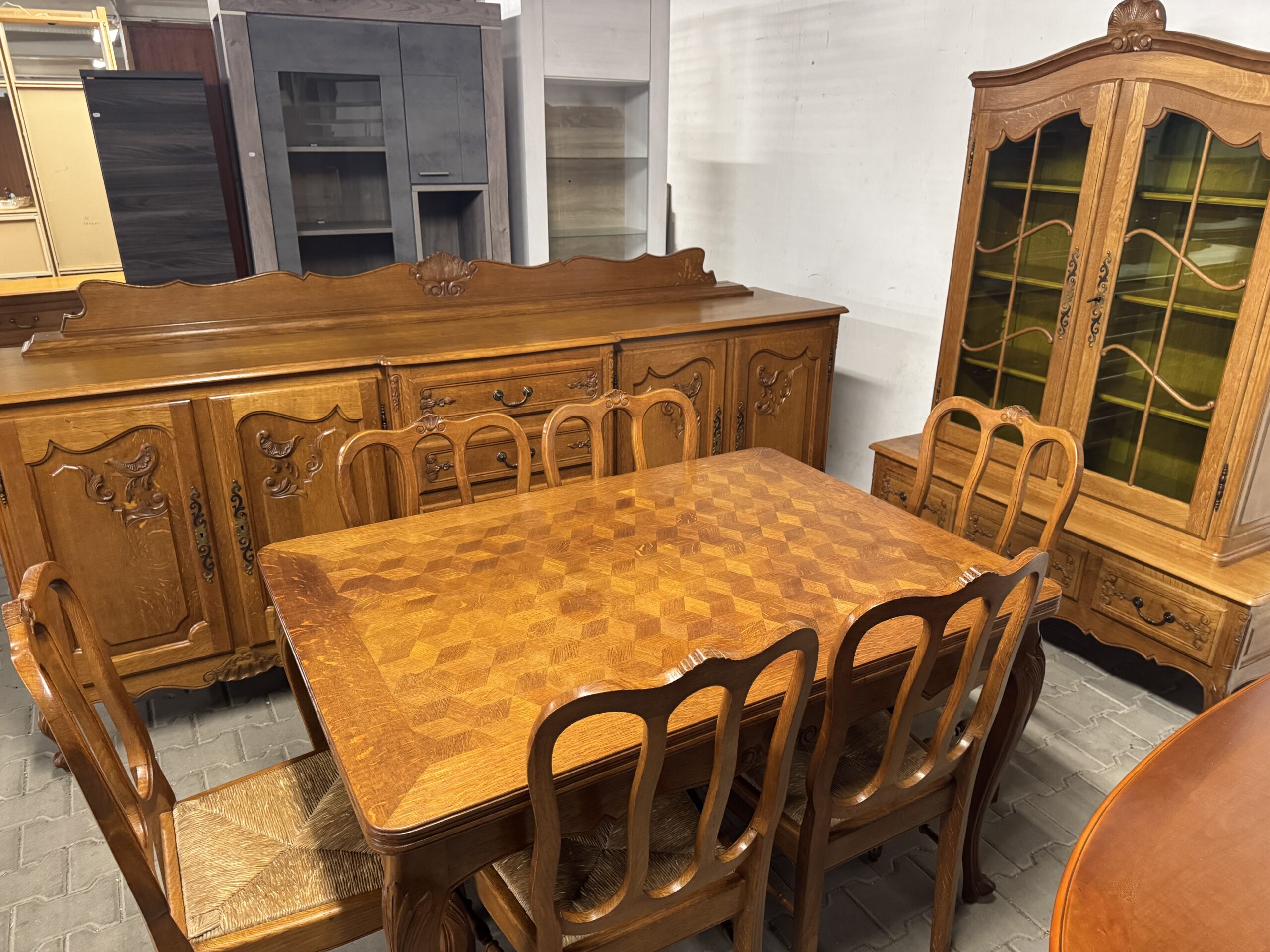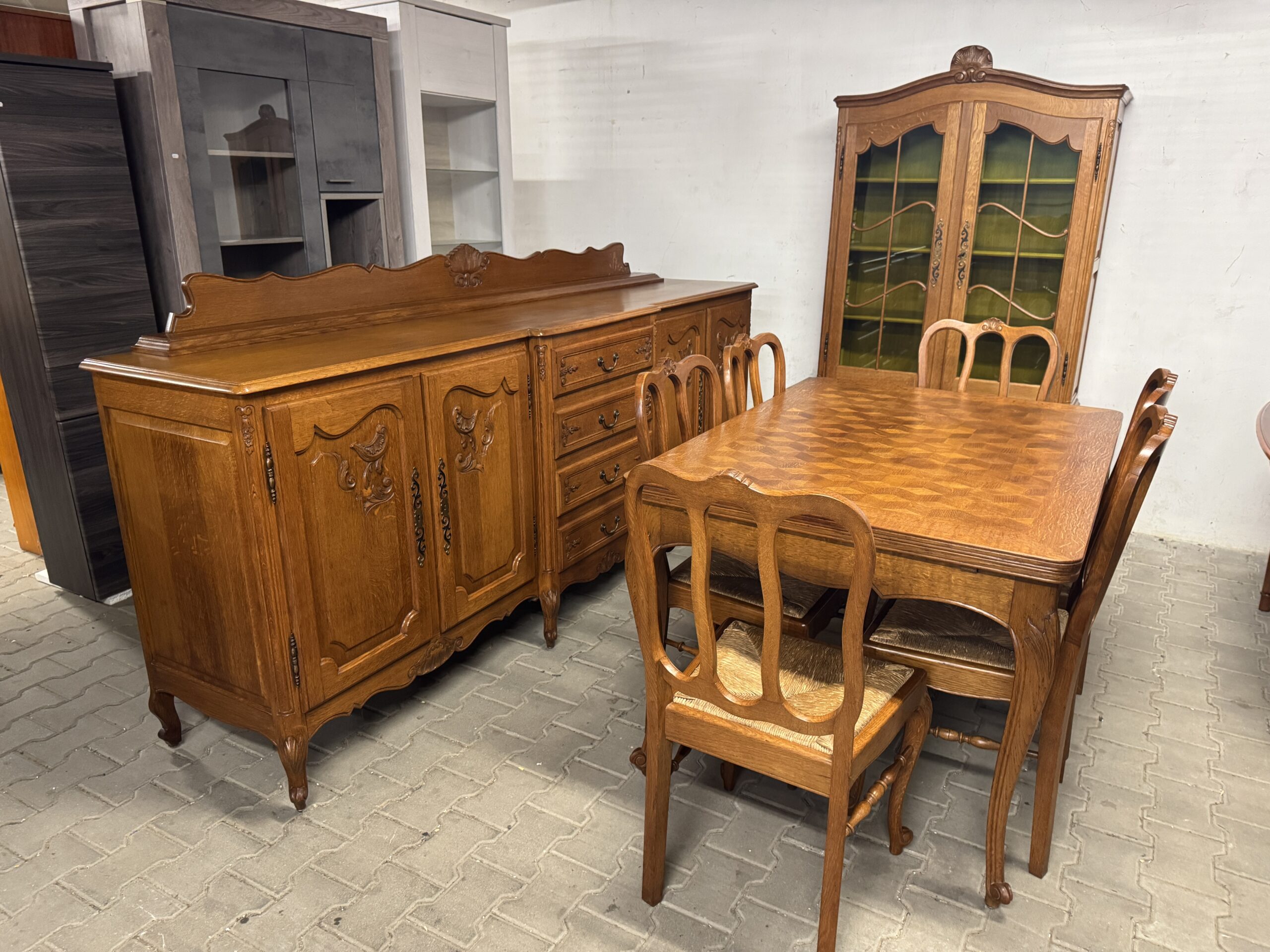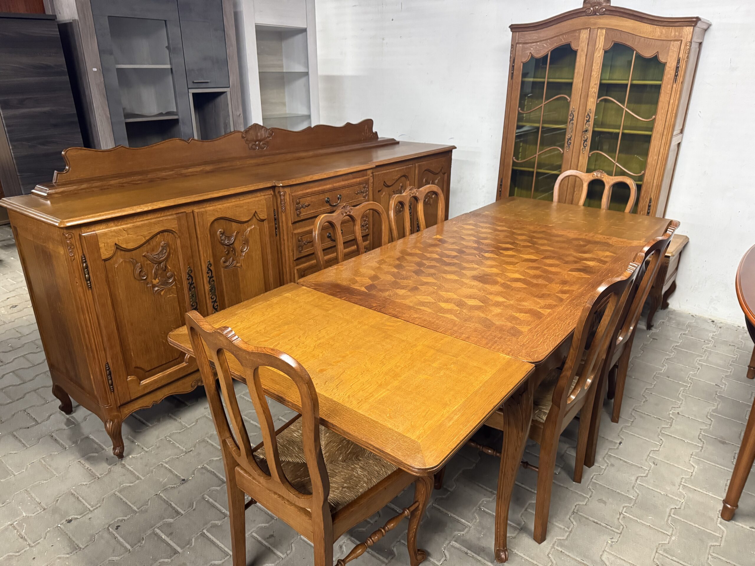 Stylowa ludwikowska jadalnia: komoda, witryna, rozkładany stół i sześć krzeseł.