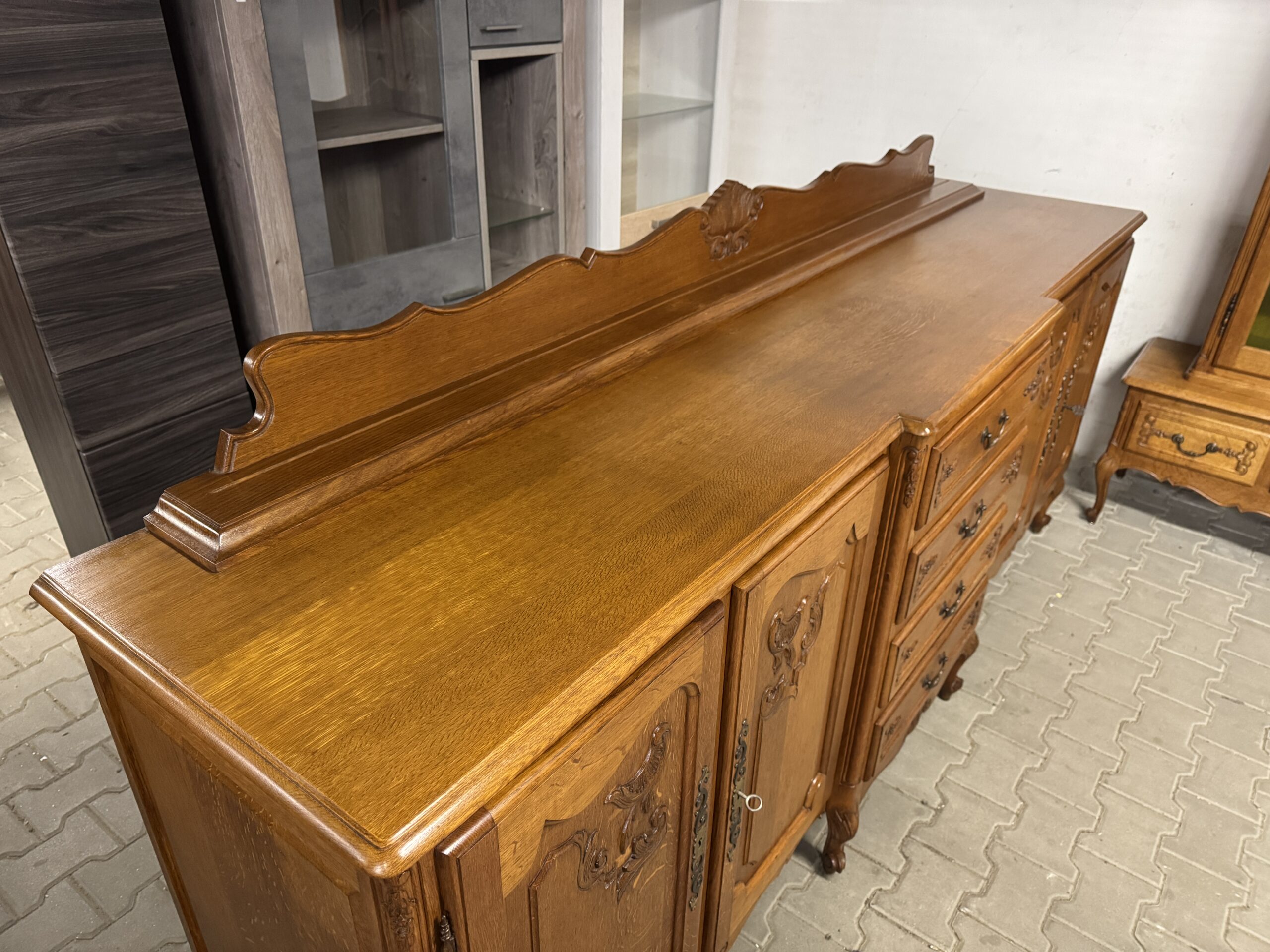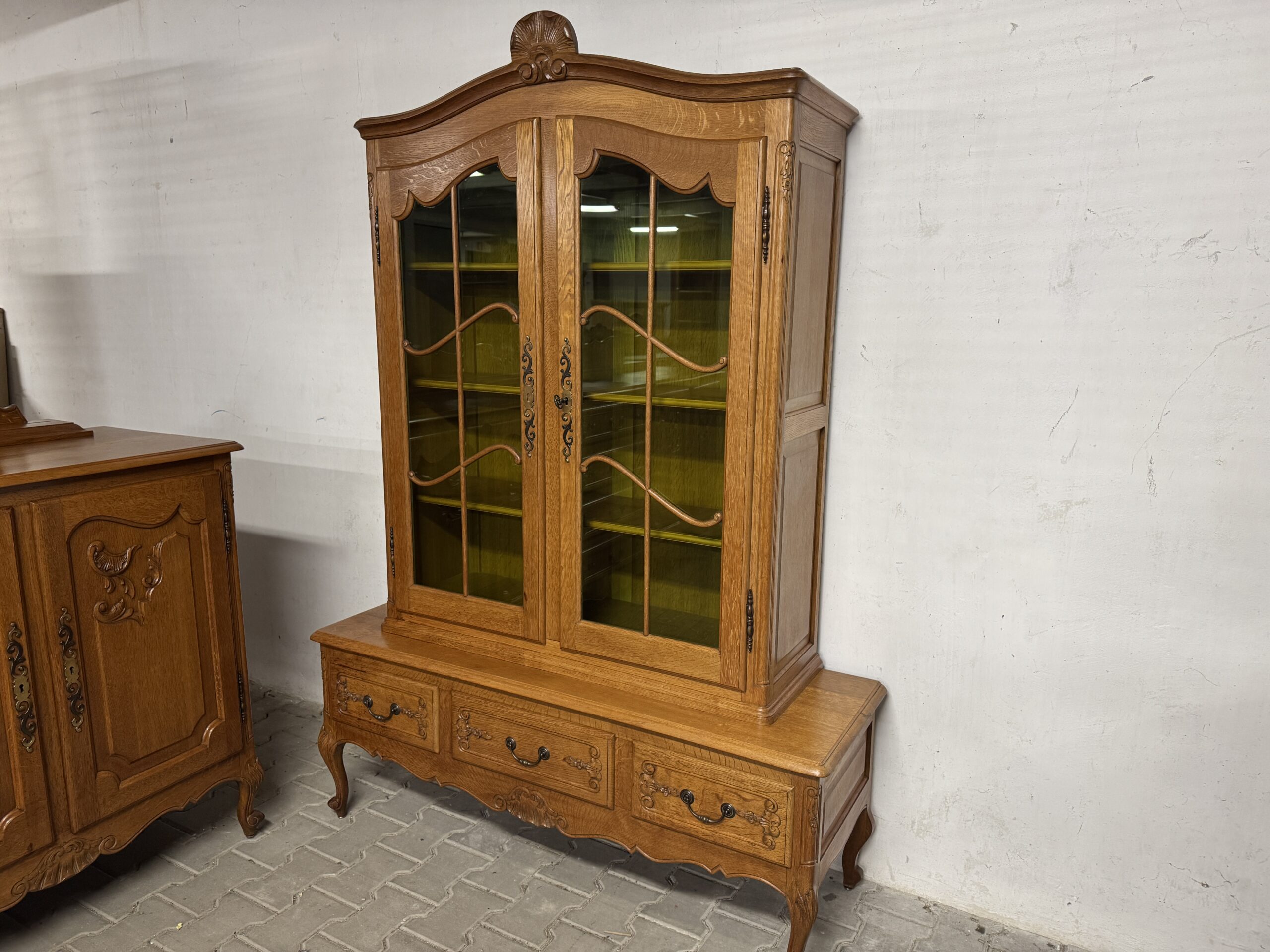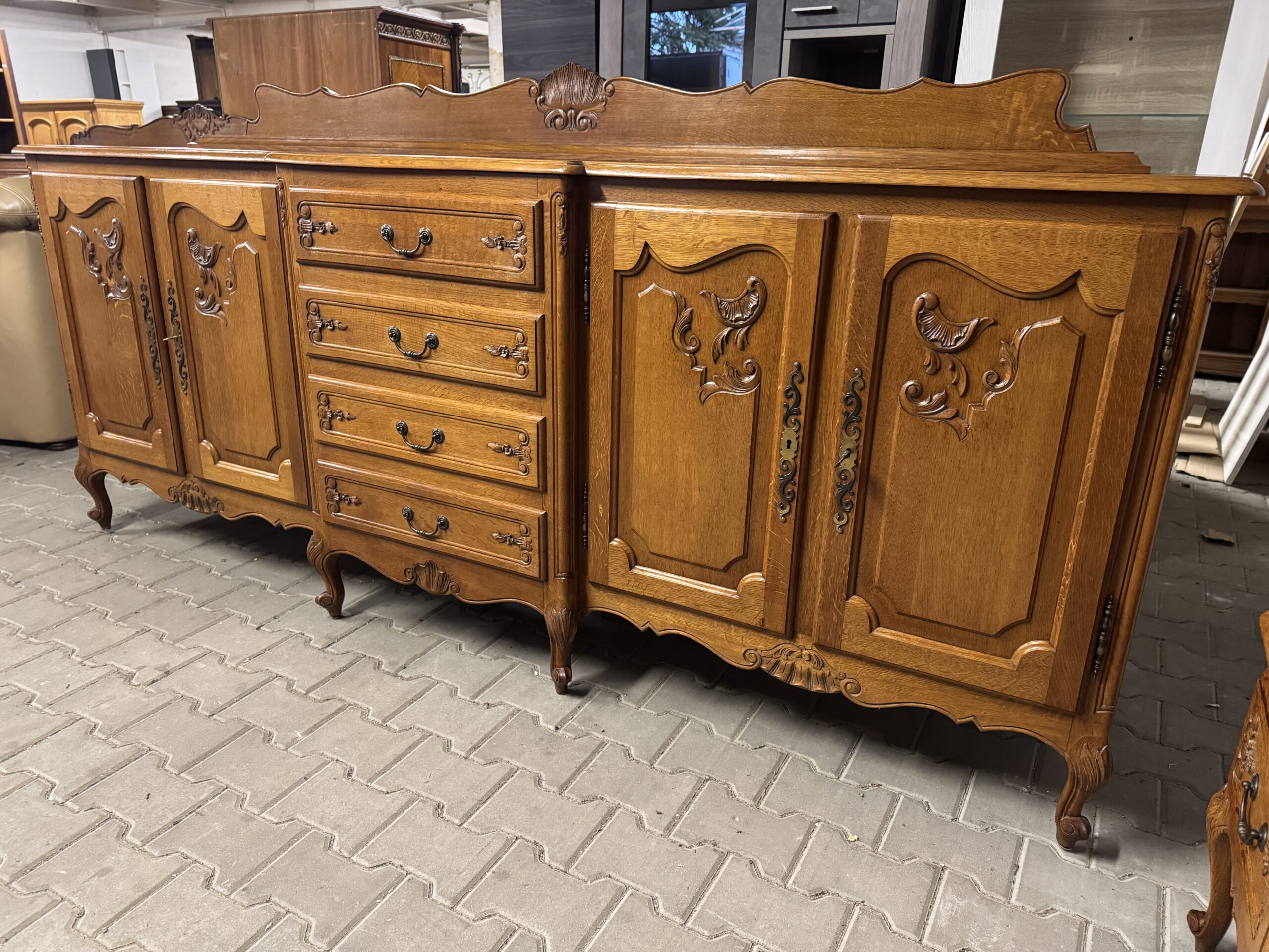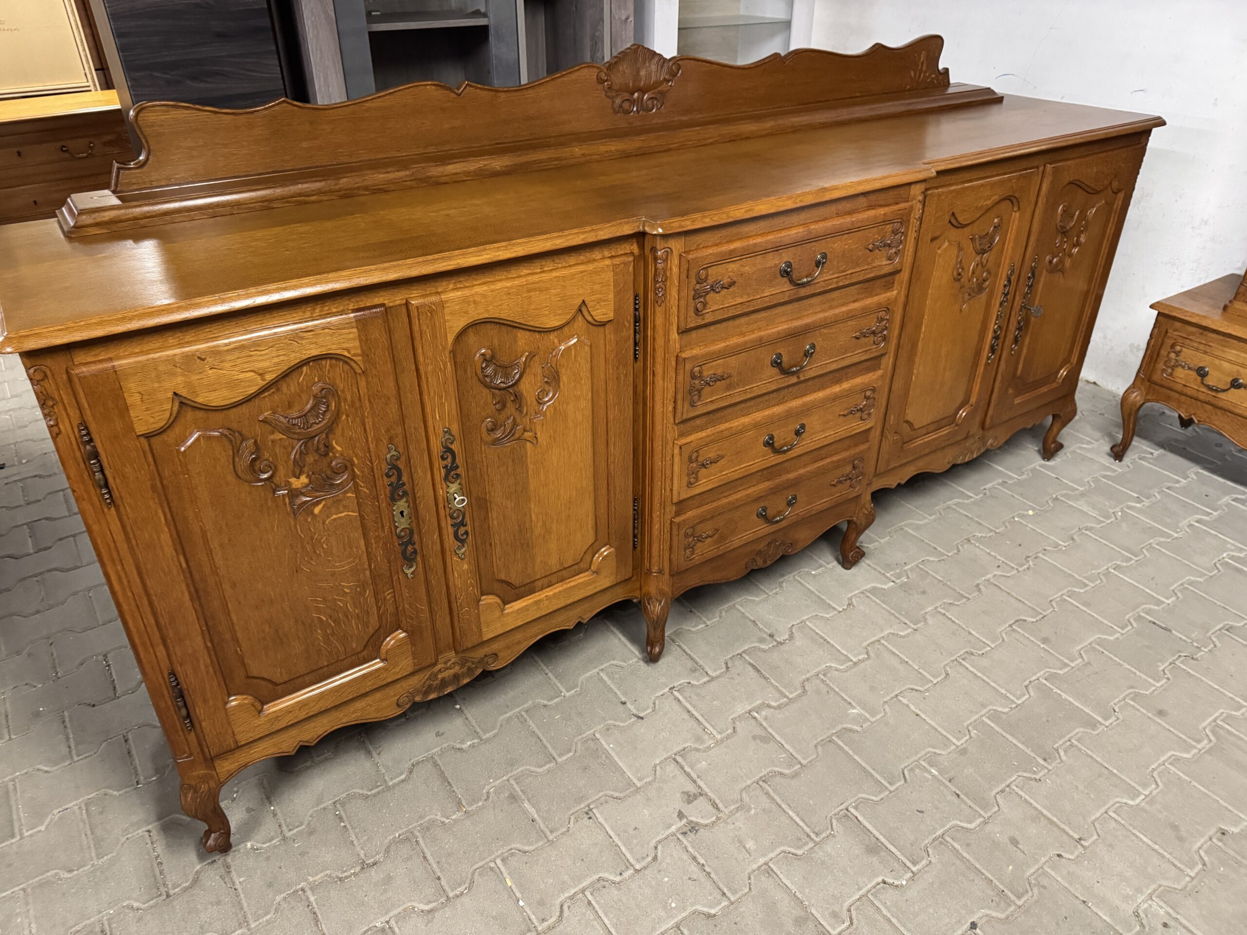Stylowa ludwikowska jadalnia: komoda, witryna, rozkładany stół i sześć krzeseł.