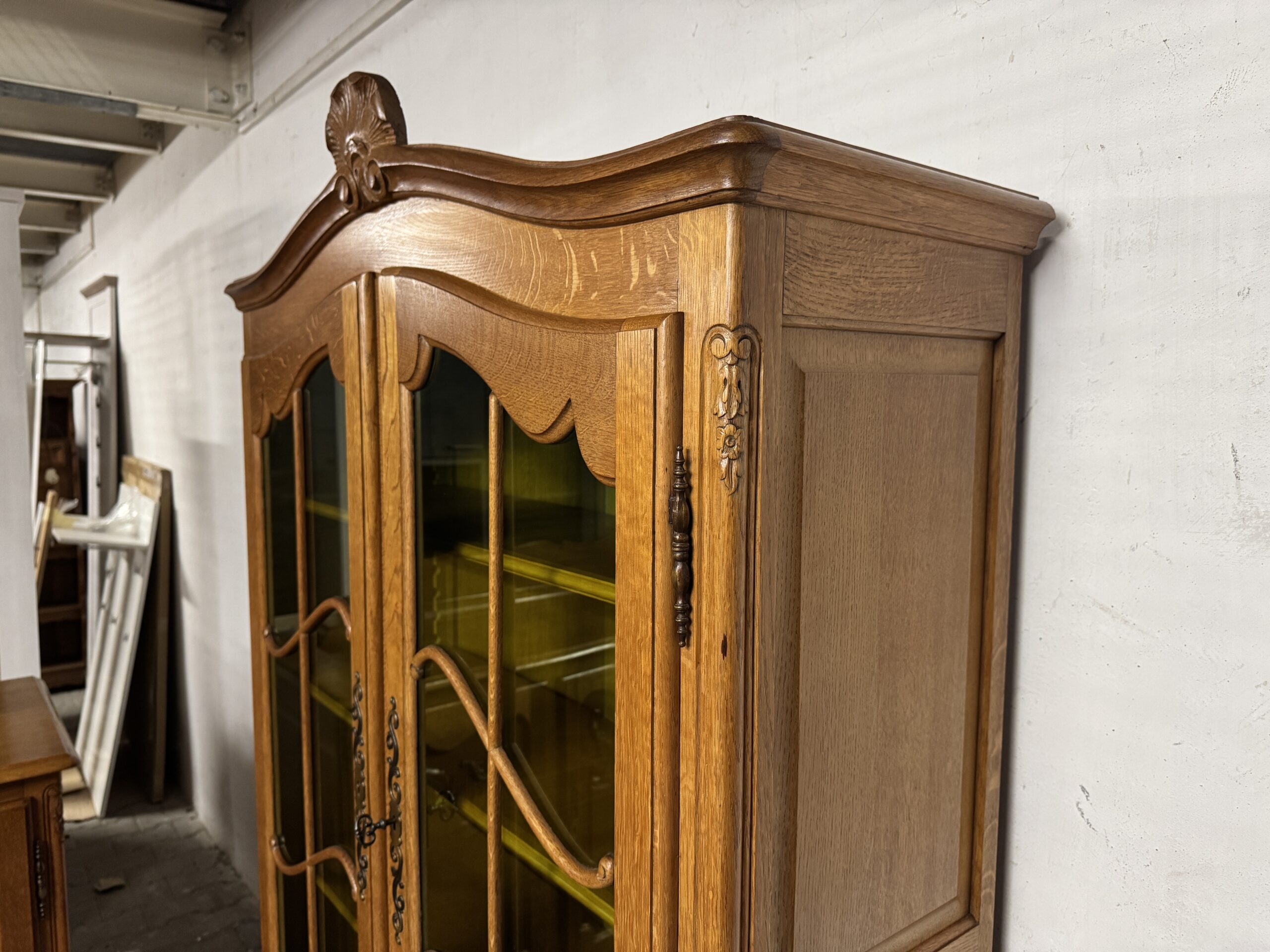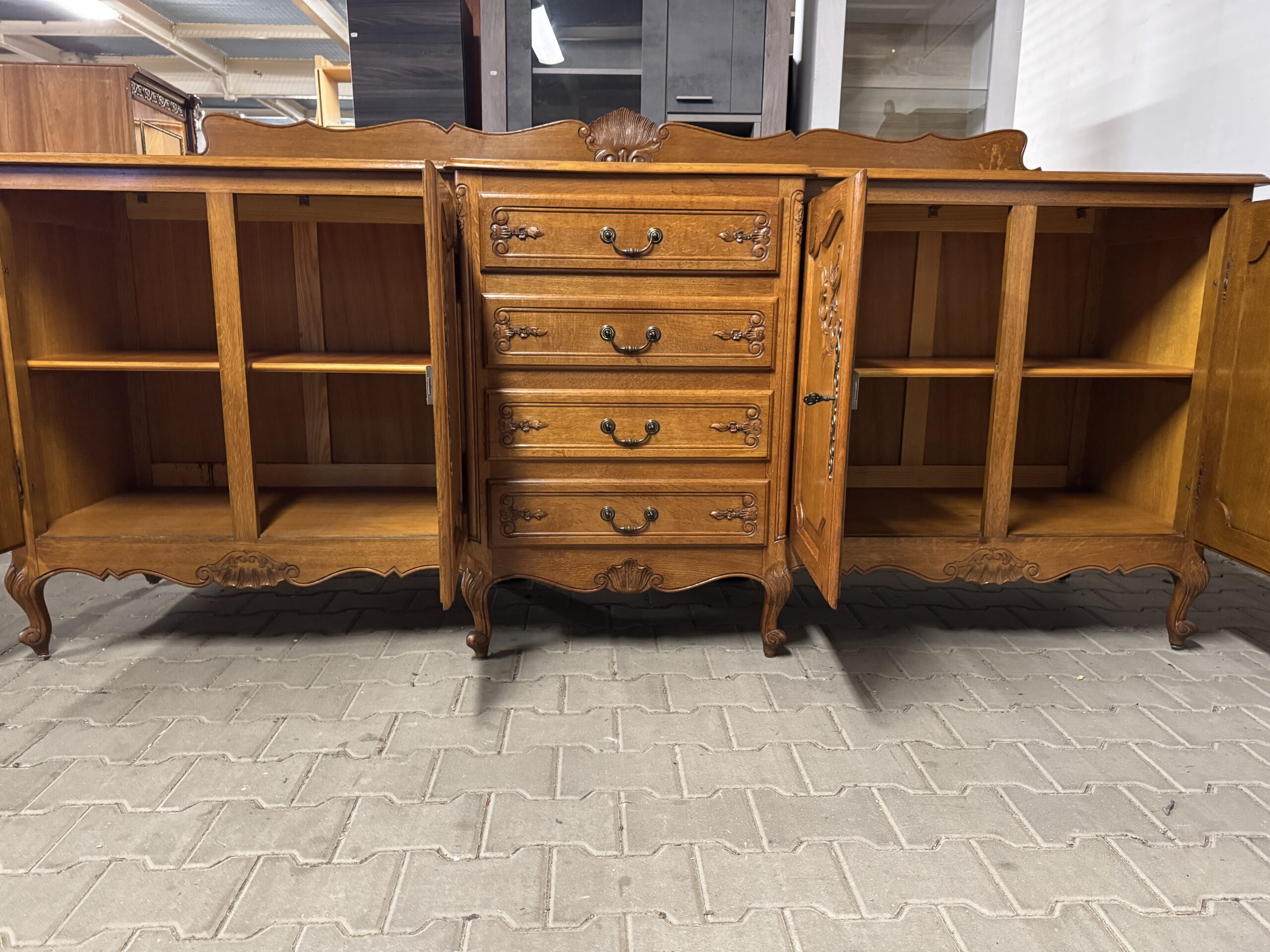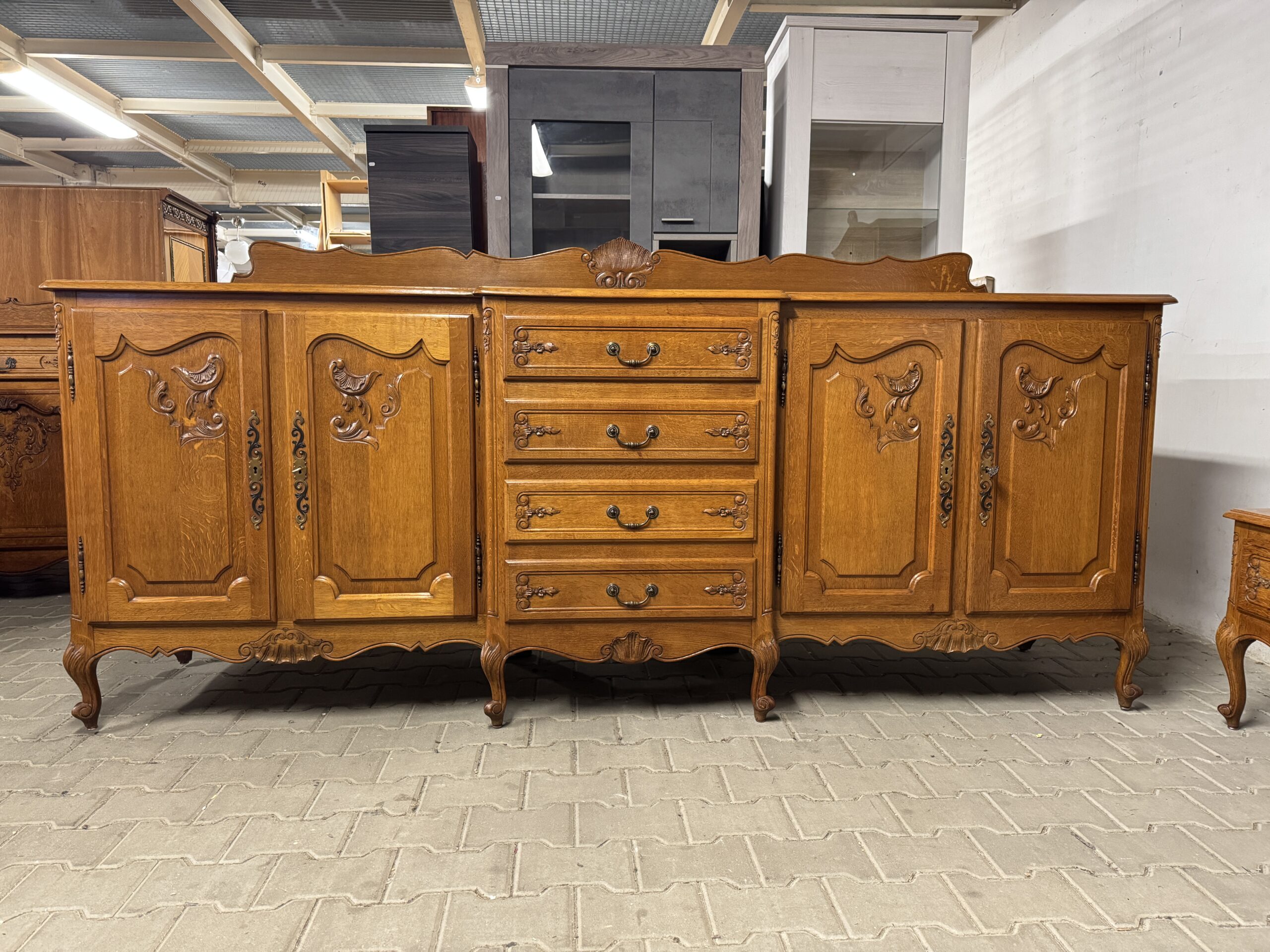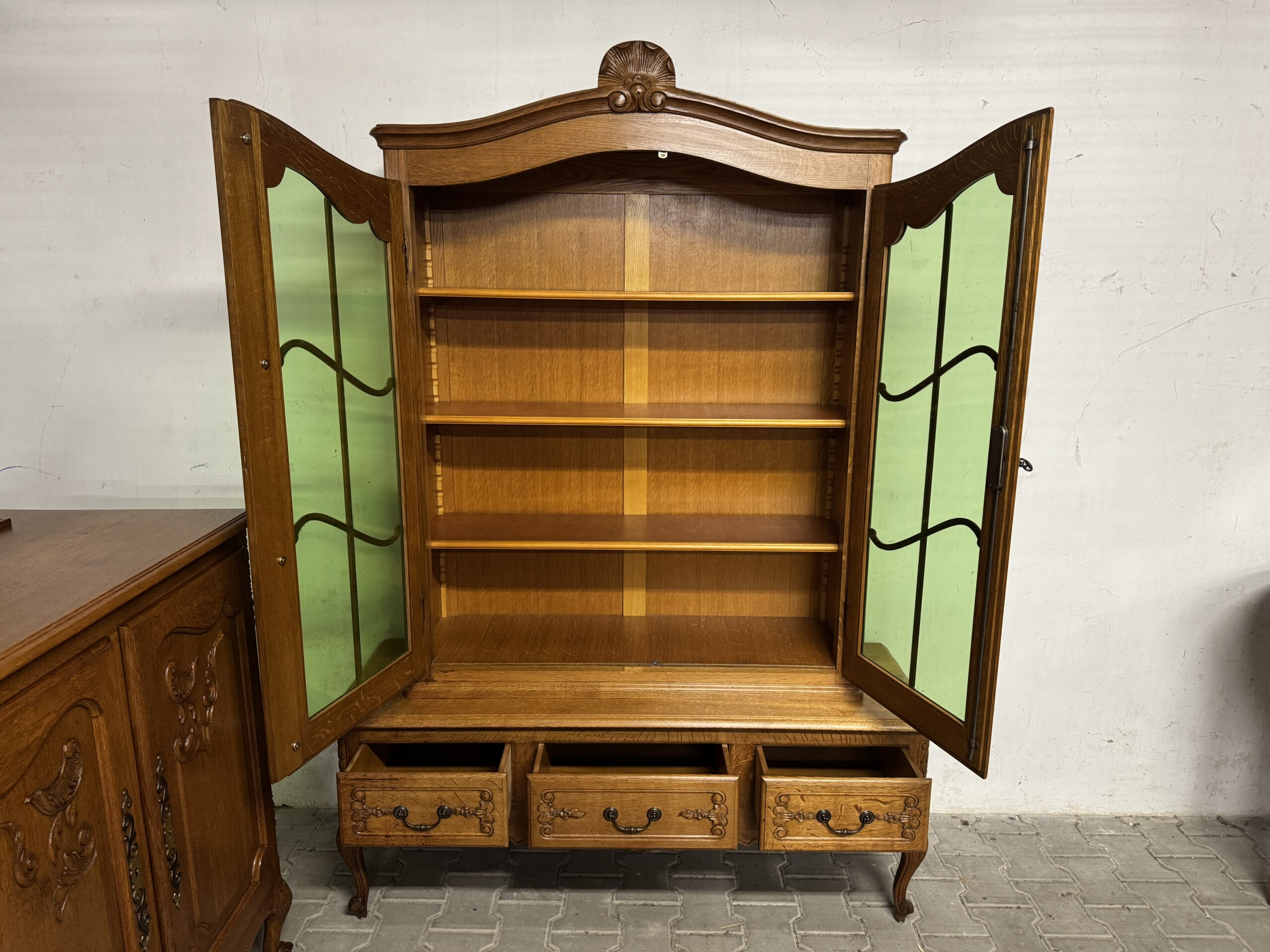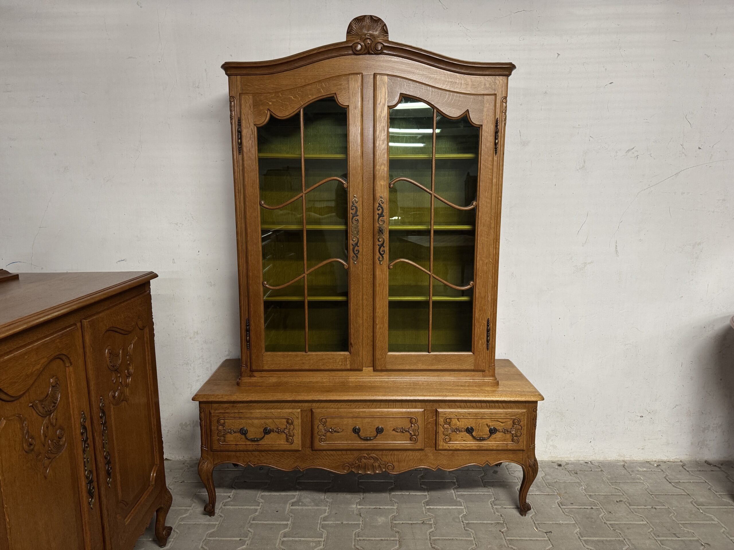 Stylowa ludwikowska jadalnia: komoda, witryna, rozkładany stół i sześć krzeseł.