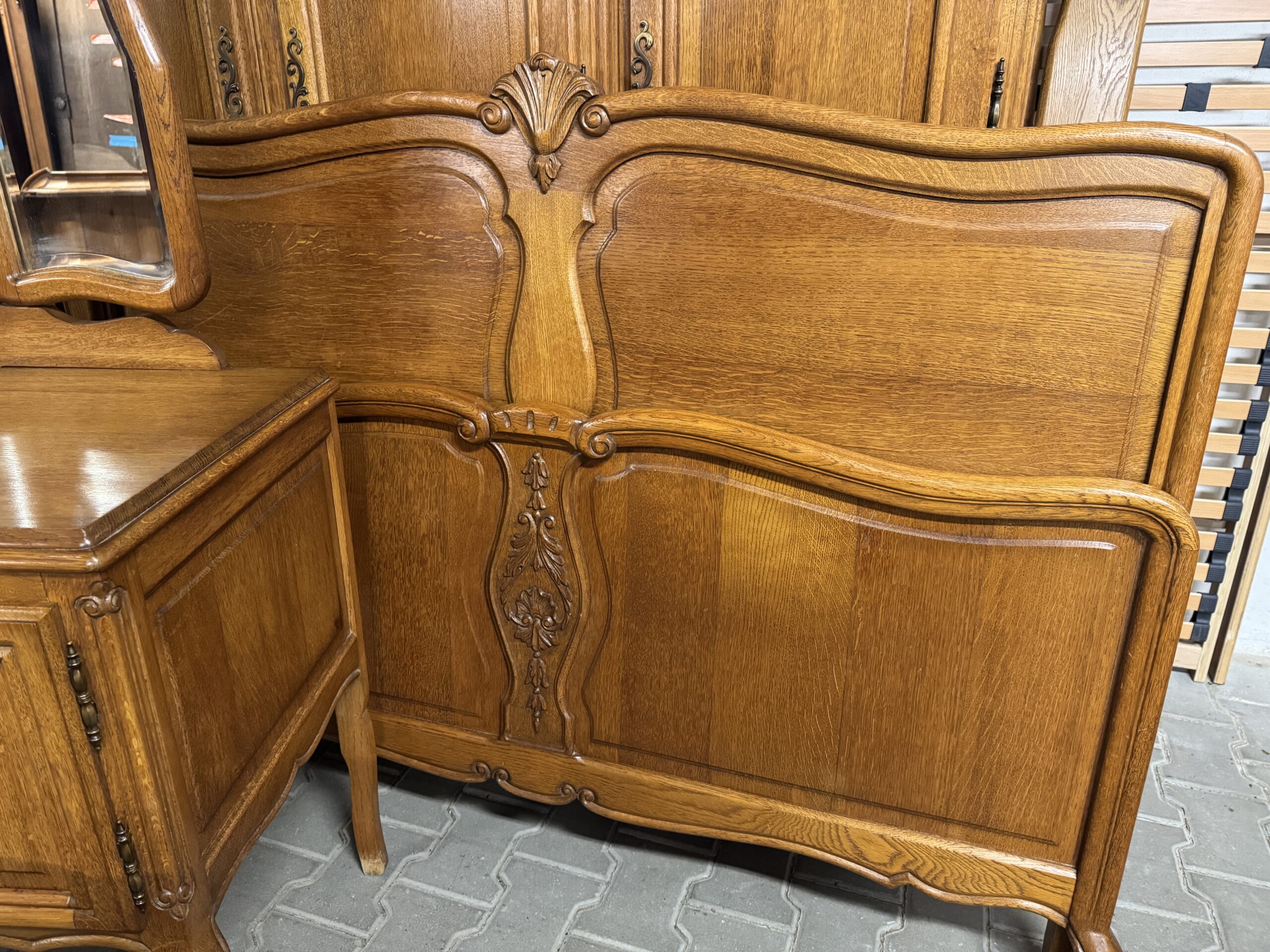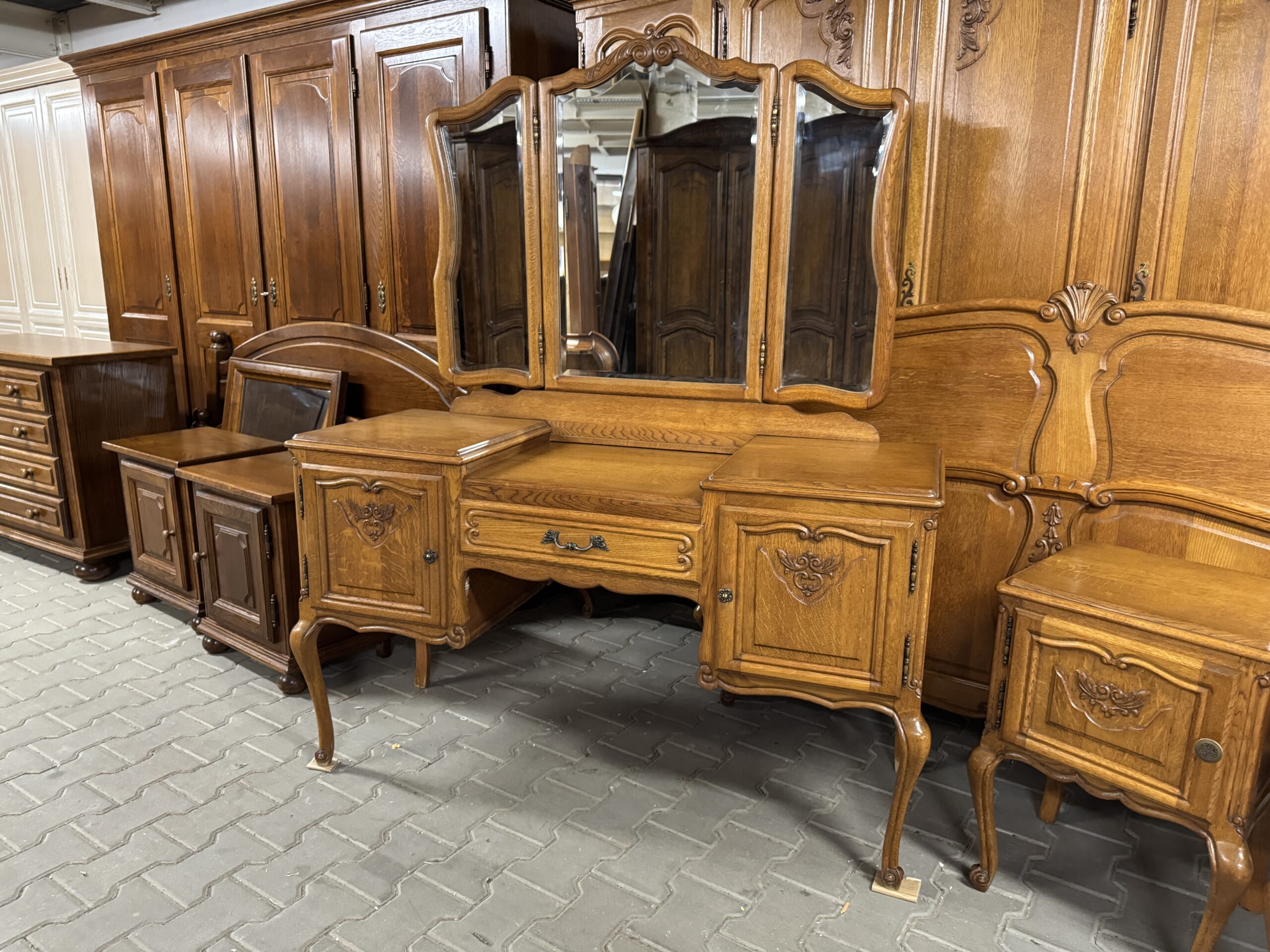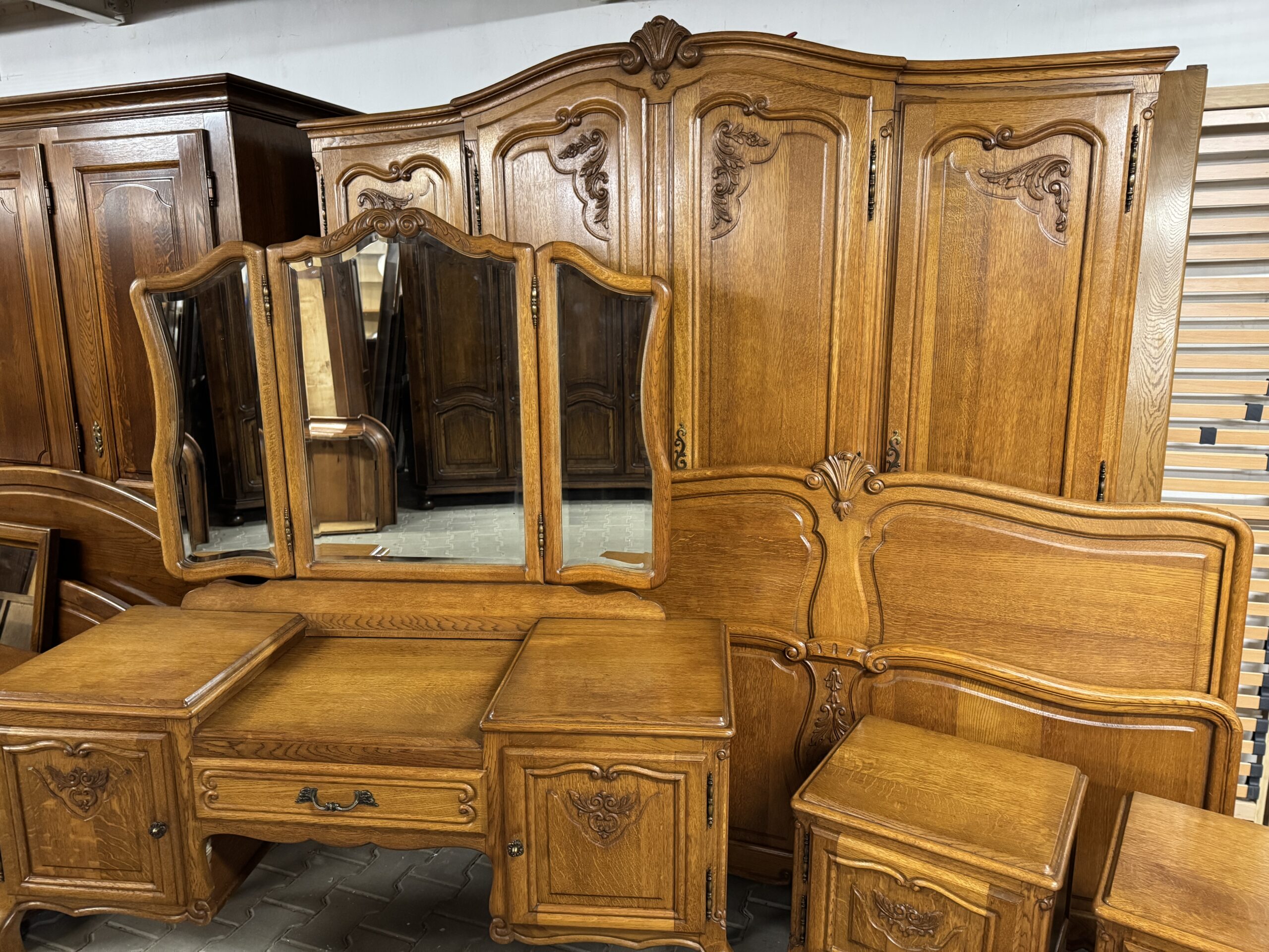 Cudowny komplet mebli w stylu ludwikowskim: czterodrzwiowa szafa, toaletka, łóżko i dwie szafki nocne.