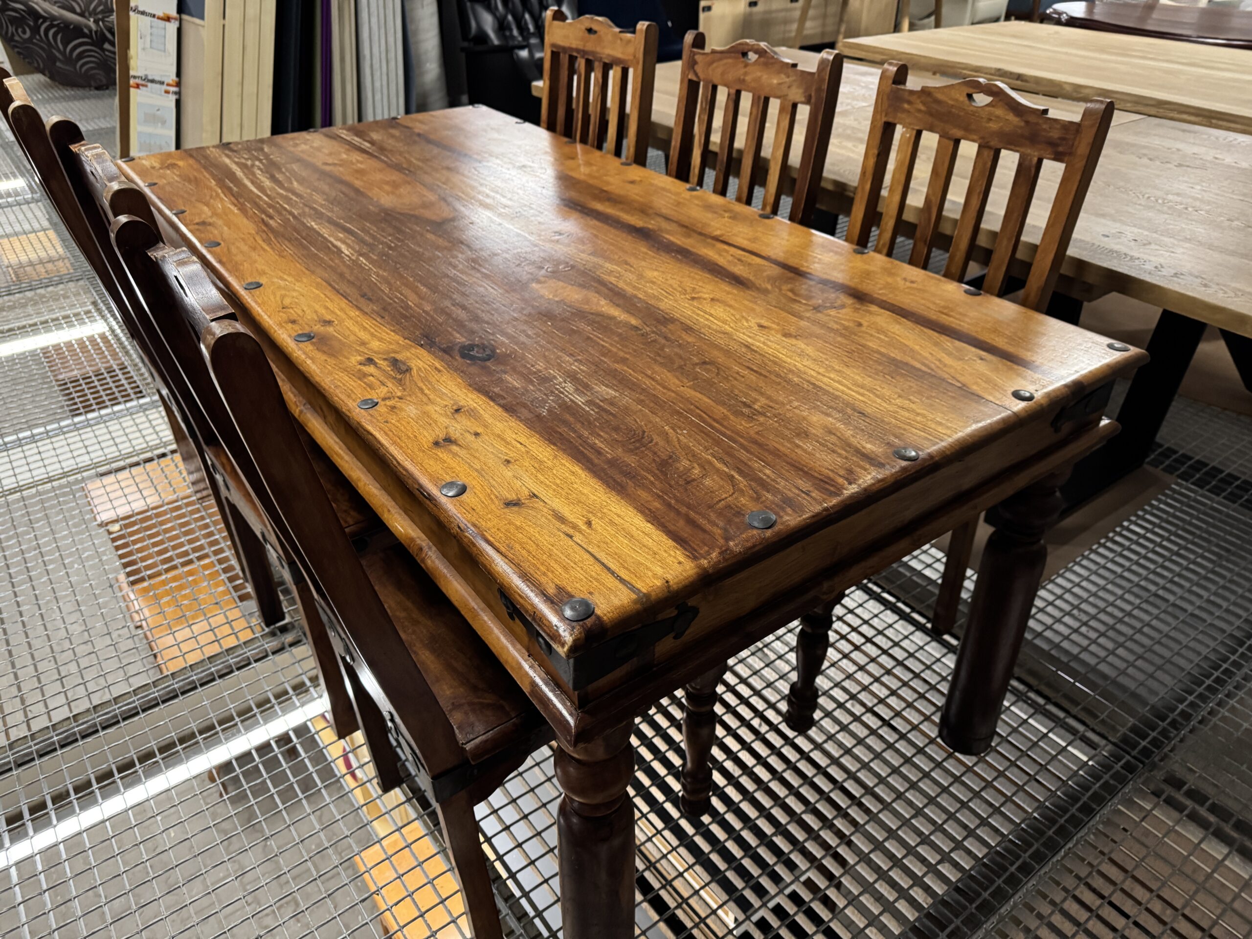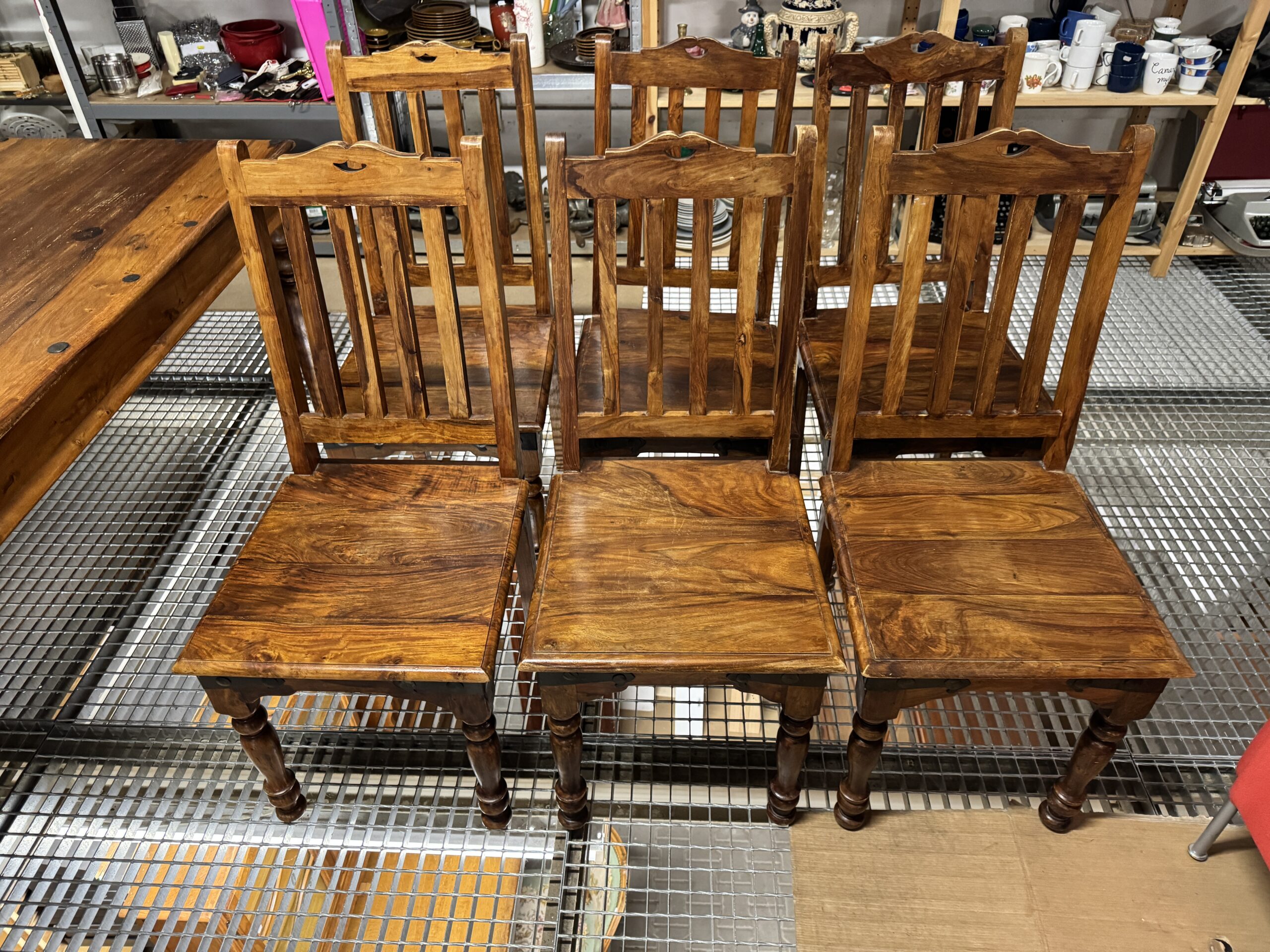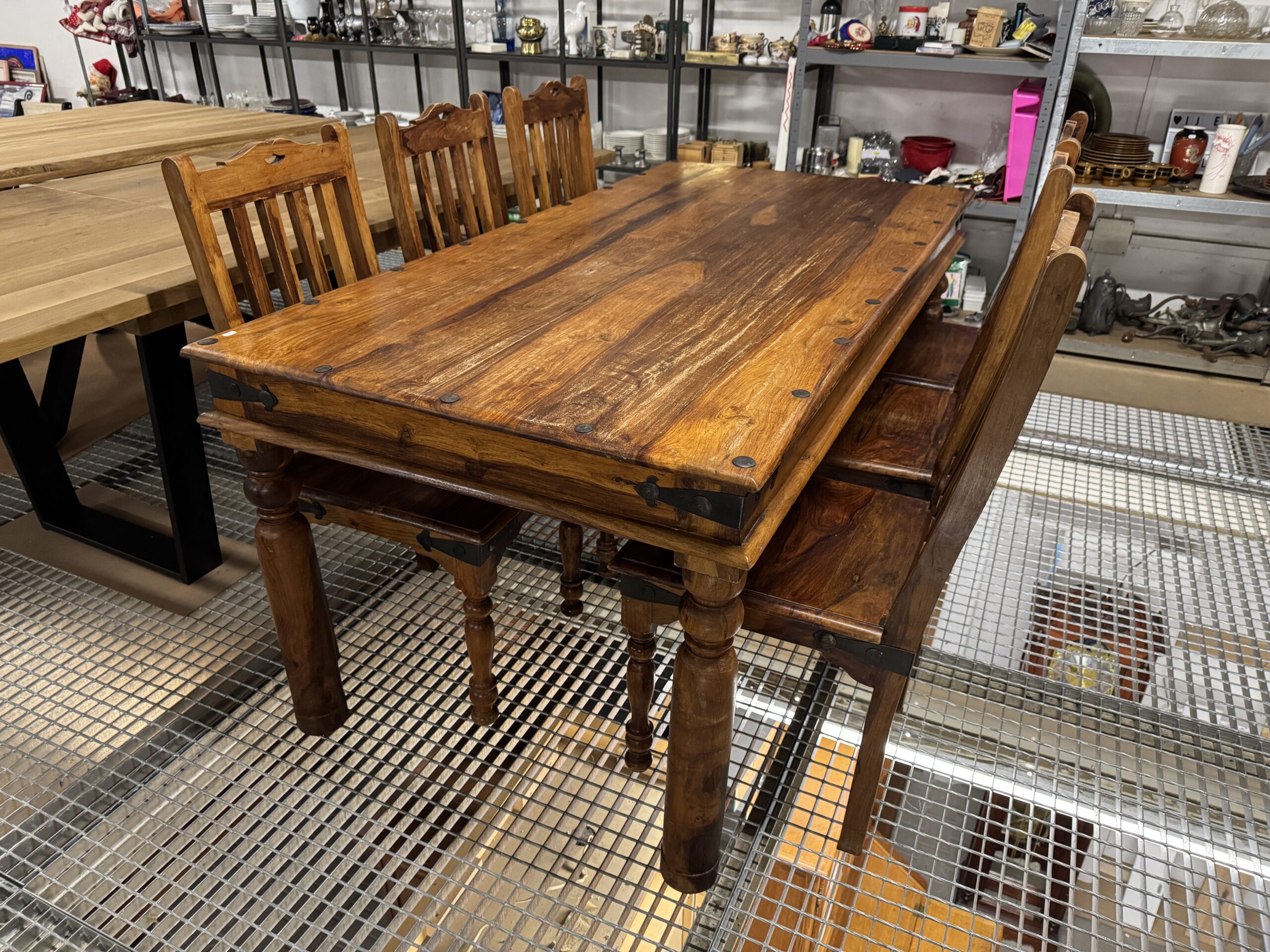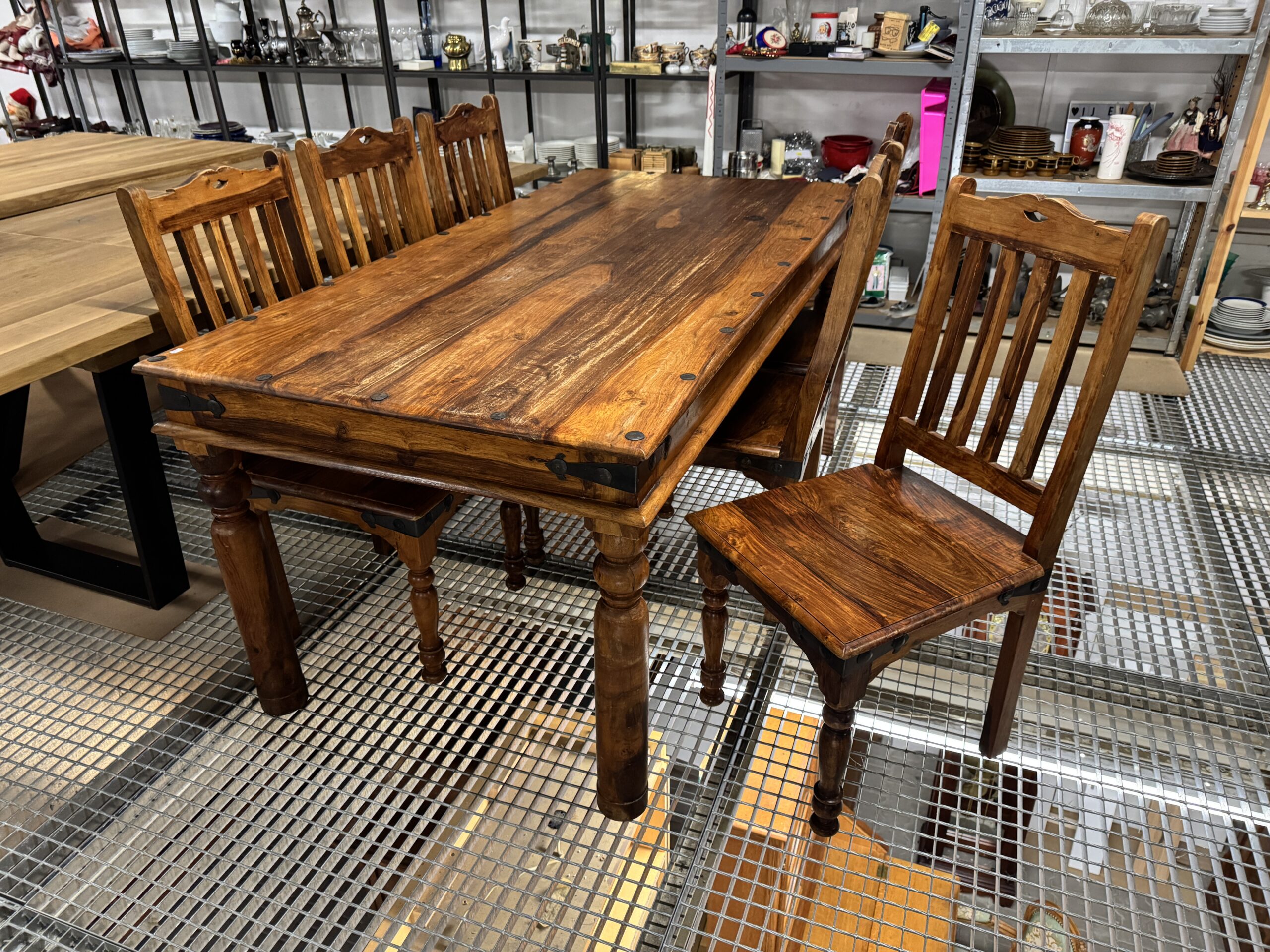 Komplet kolonialnych mebli: stół i sześć krzeseł.